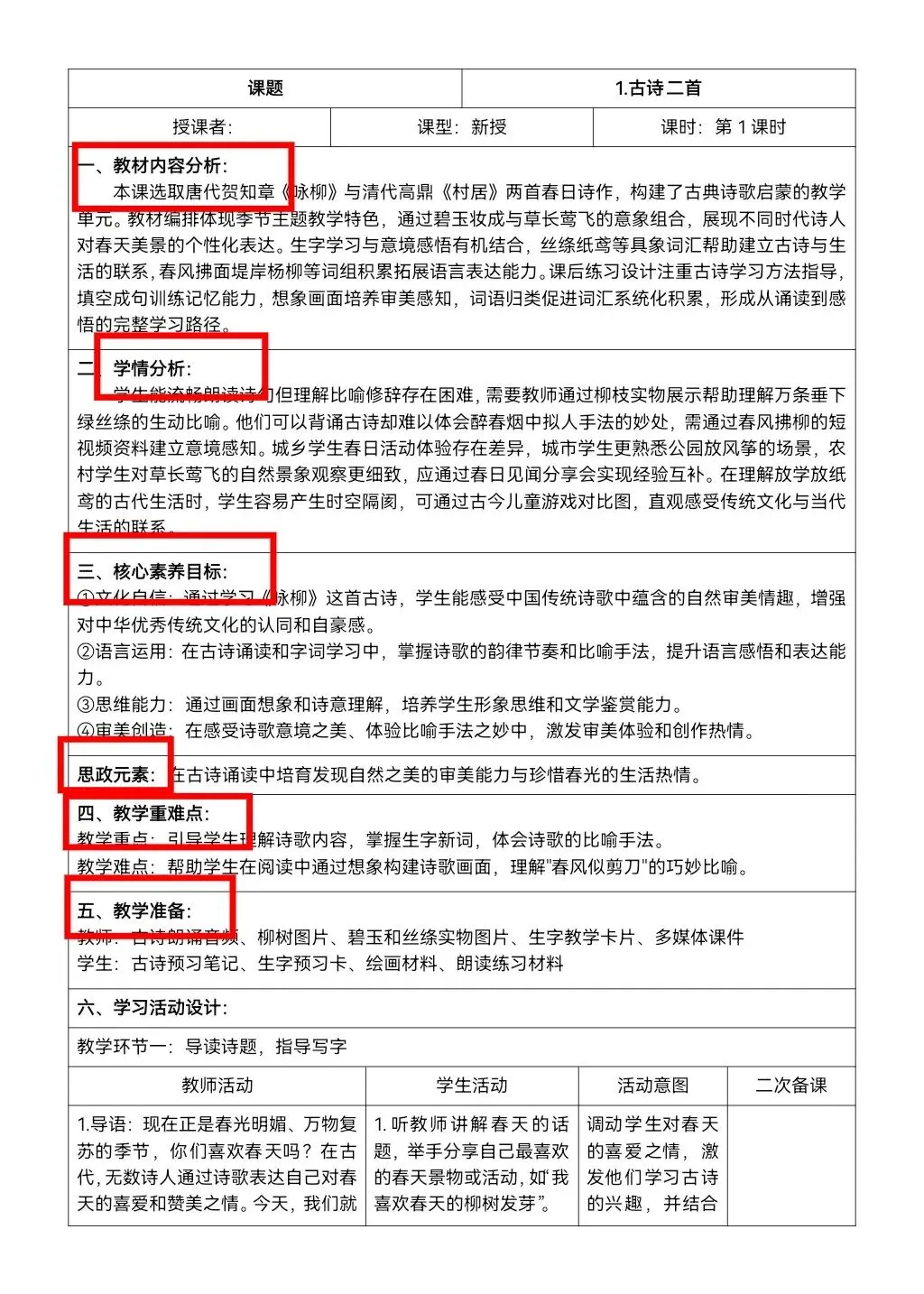 >26年最新版核心素养教案,含教师活动,学生活动,设计意图,二次备课