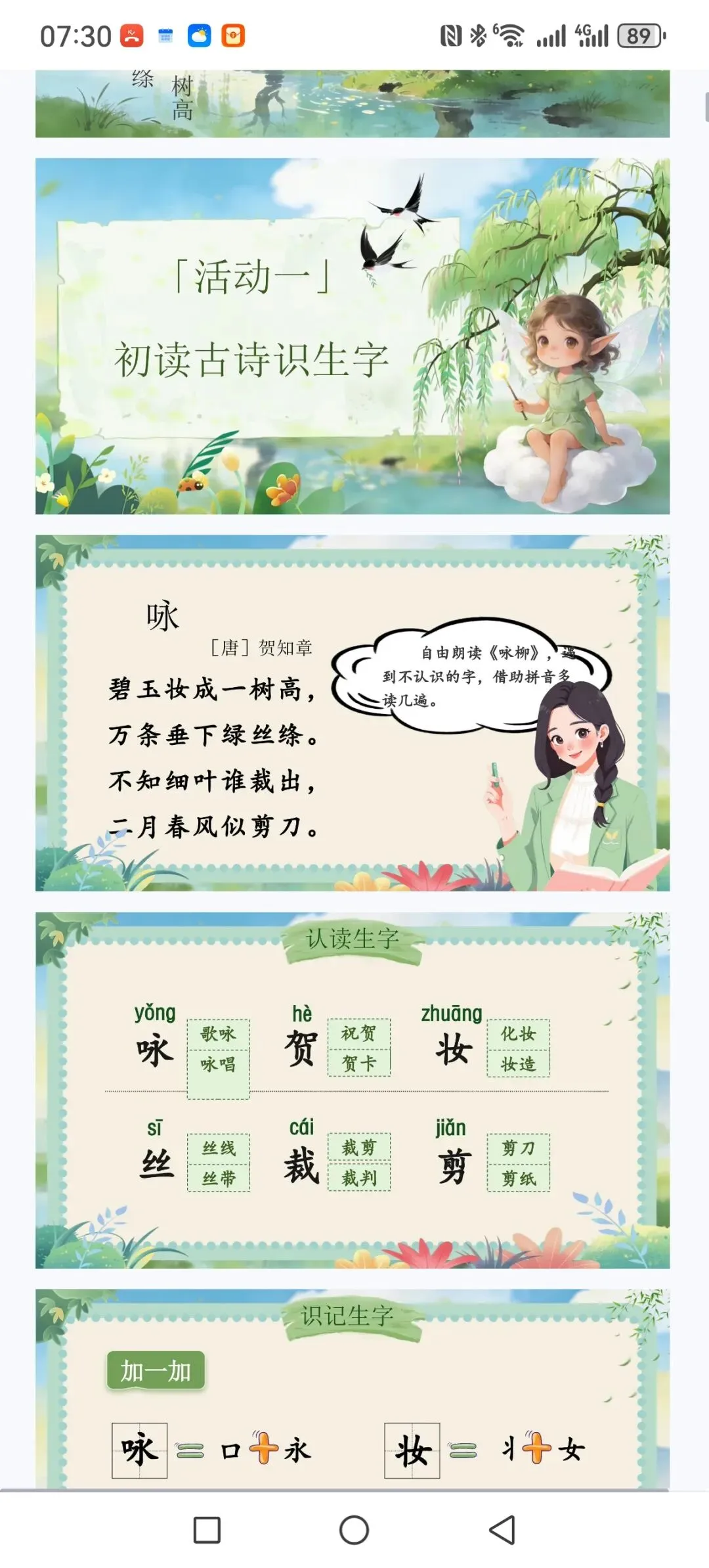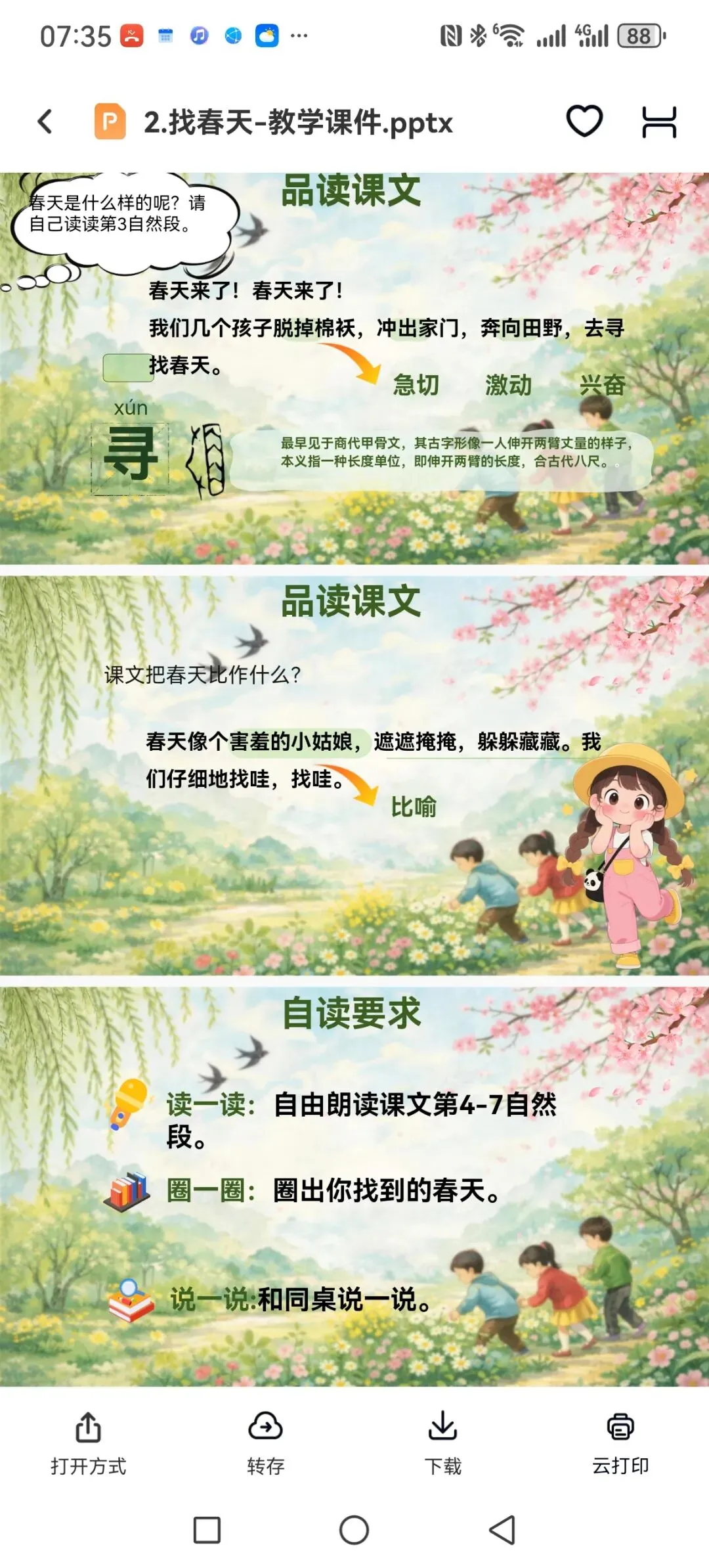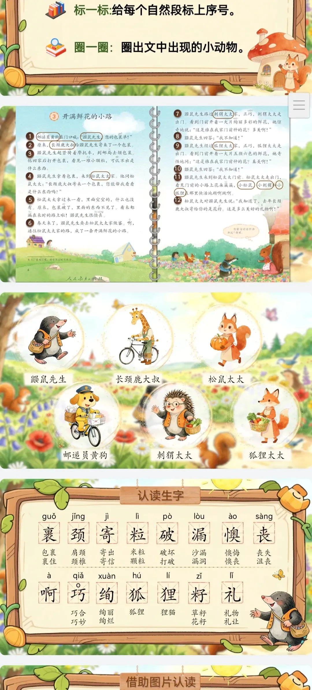 配套课件视觉清新、互动性强、低段友好,以春景图、动态生字、情境动画、朗读音频为载体,降低理解门槛、提升课堂趣味。课件板块清晰:情境导入—任务驱动—识字学词—品读感悟—语言运用—实践拓展—当堂检测—总结升华,与教案流程高度同步,教师无需额外调整即可直接授课。生字教学突出笔顺拆解、偏旁归类、形近字对比与语境运用;朗读指导标注停顿、重音与语气提示,配合范读与分层练读,助力学生读准、读通、读出画面感。
