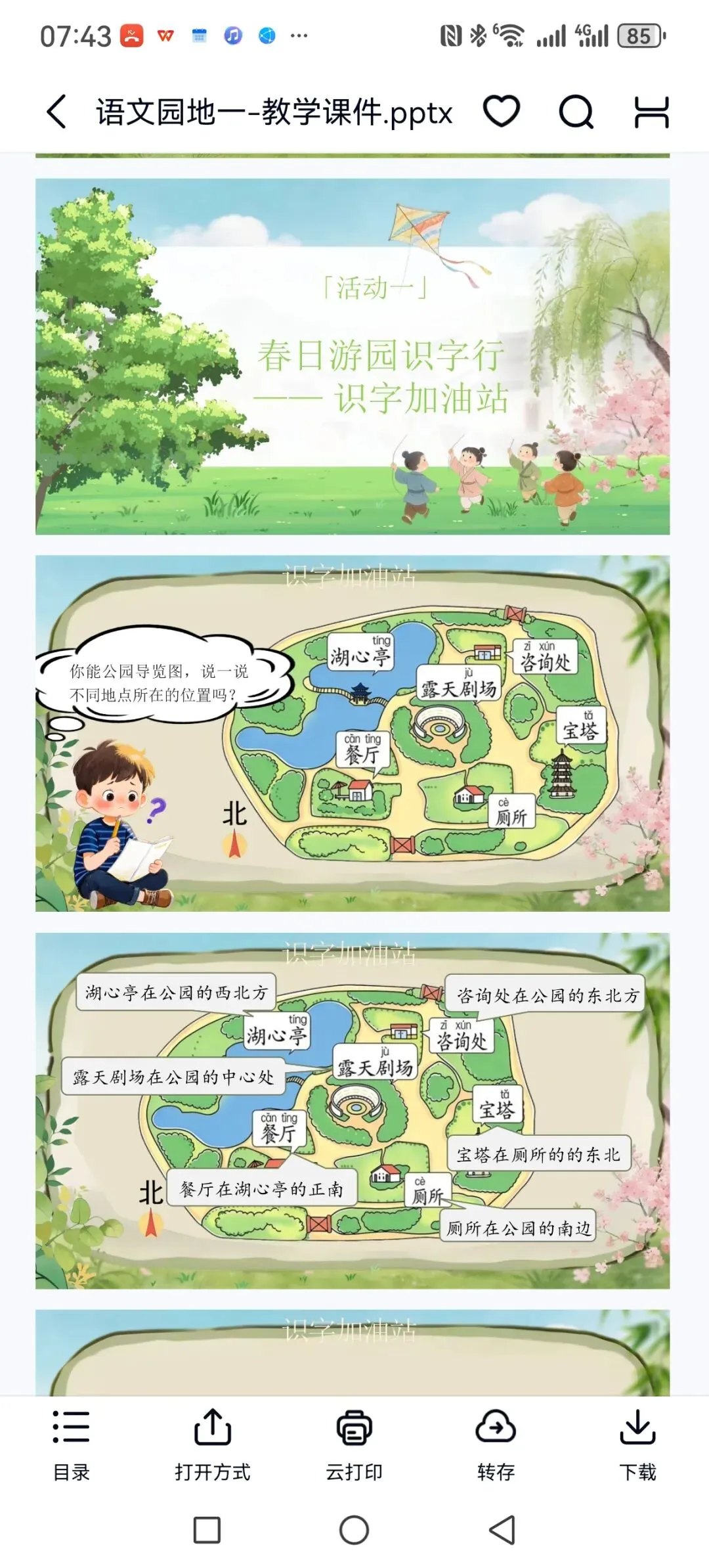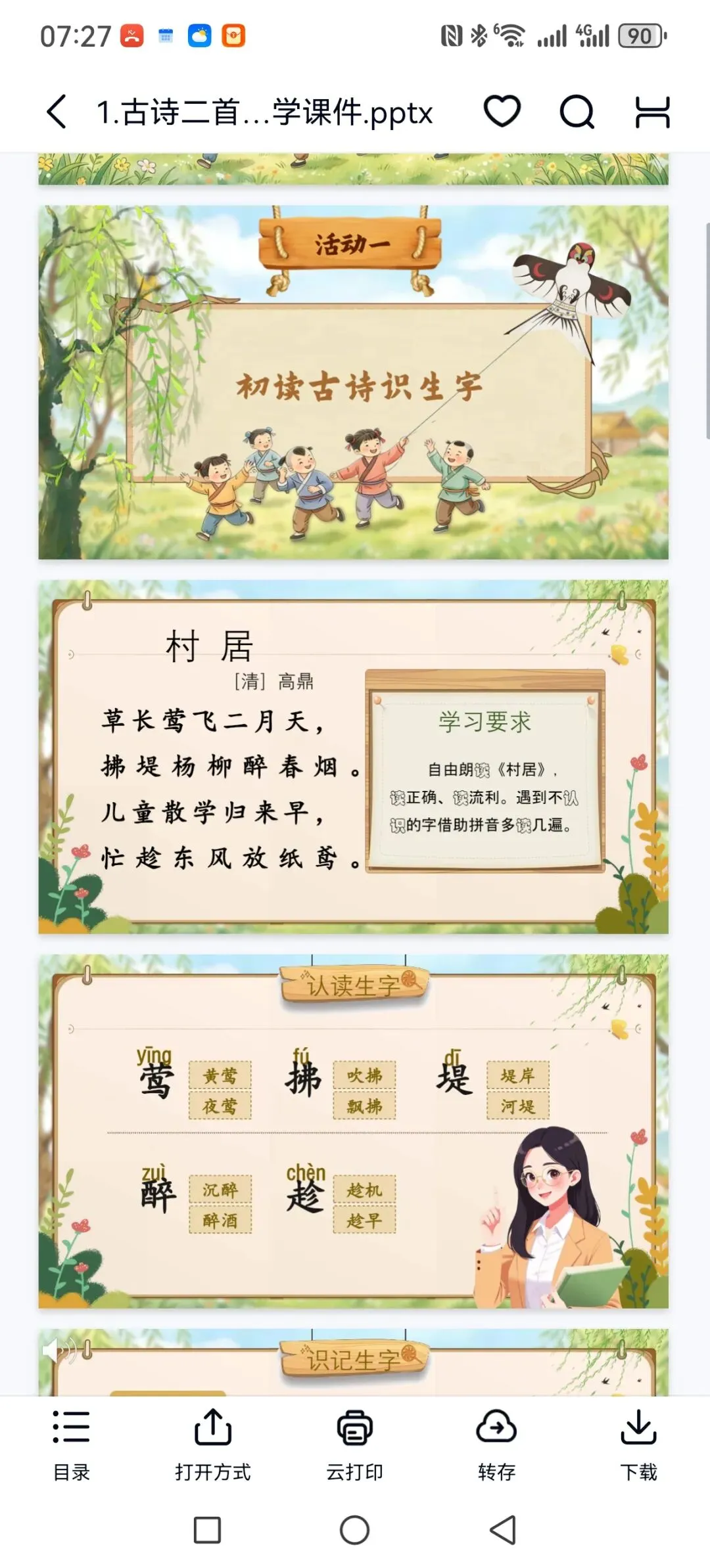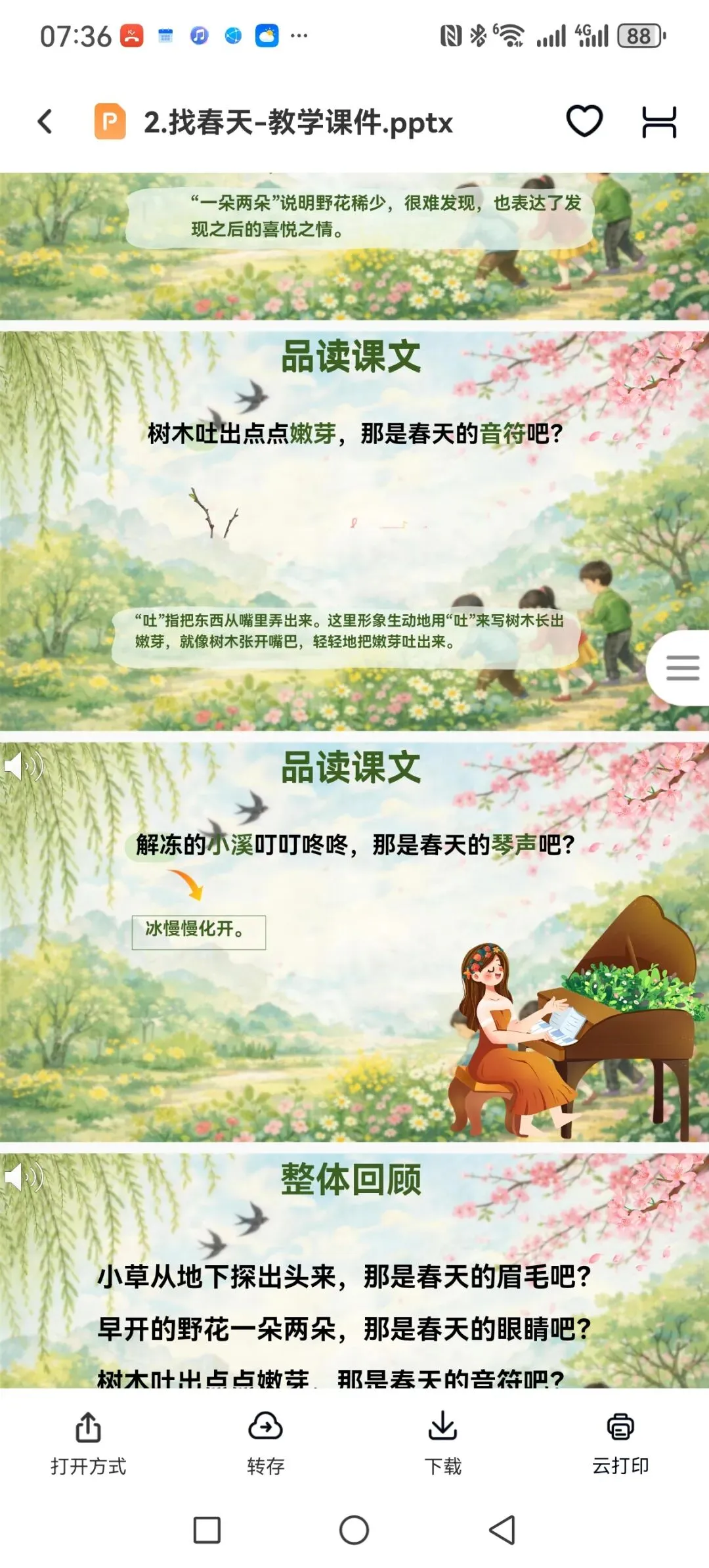 配套课件视觉清新、互动性强、低段友好,以春景图、动态生字、情境动画、朗读音频为载体,降低理解门槛、提升课堂趣味。课件板块清晰:情境导入—任务驱动—识字学词—品读感悟—语言运用—实践拓展—当堂检测—总结升华,与教案流程高度同步,教师无需额外调整即可直接授课。生字教学突出笔顺拆解、偏旁归类、形近字对比与语境运用;朗读指导标注停顿、重音与语气提示,配合范读与分层练读,助力学生读准、读通、读出画面感。