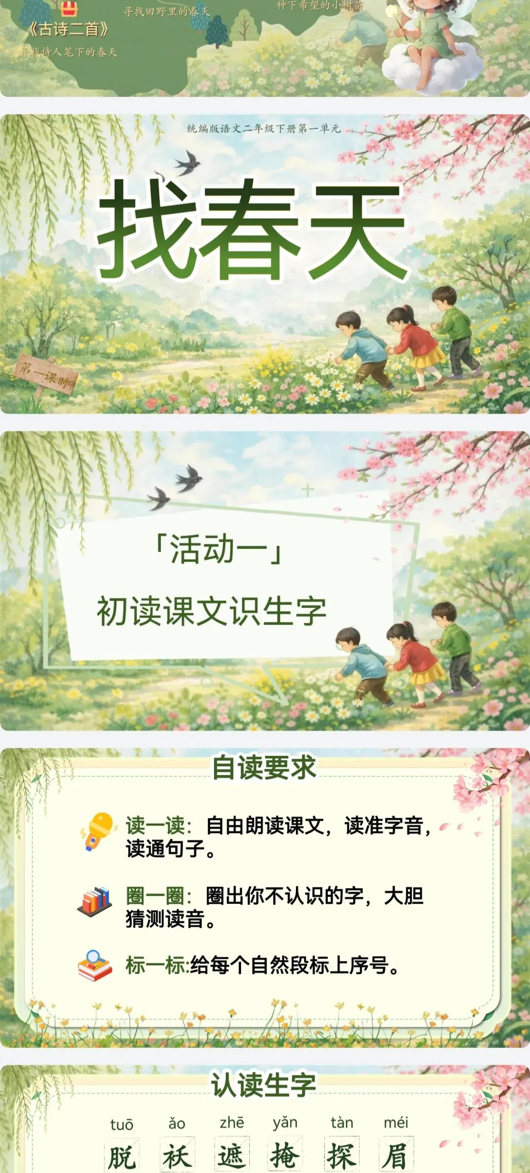 本单元包含《古诗二首》《找春天》《开满鲜花的小路》《邓小平爷爷植树》四篇课文,搭配口语交际《注意说话的语气》、语文园地一与整本书阅读延伸。课件与教案以**“春天探秘小达人”为核心情境,设置总任务:举办班级“春天播报会”**,拆解为四大递进式子任务,层层落地识字写字、朗读感悟、语言运用、审美体验与文化传承目标,让学习真实发生、让素养可见可评。
