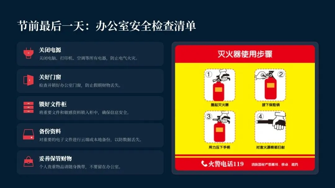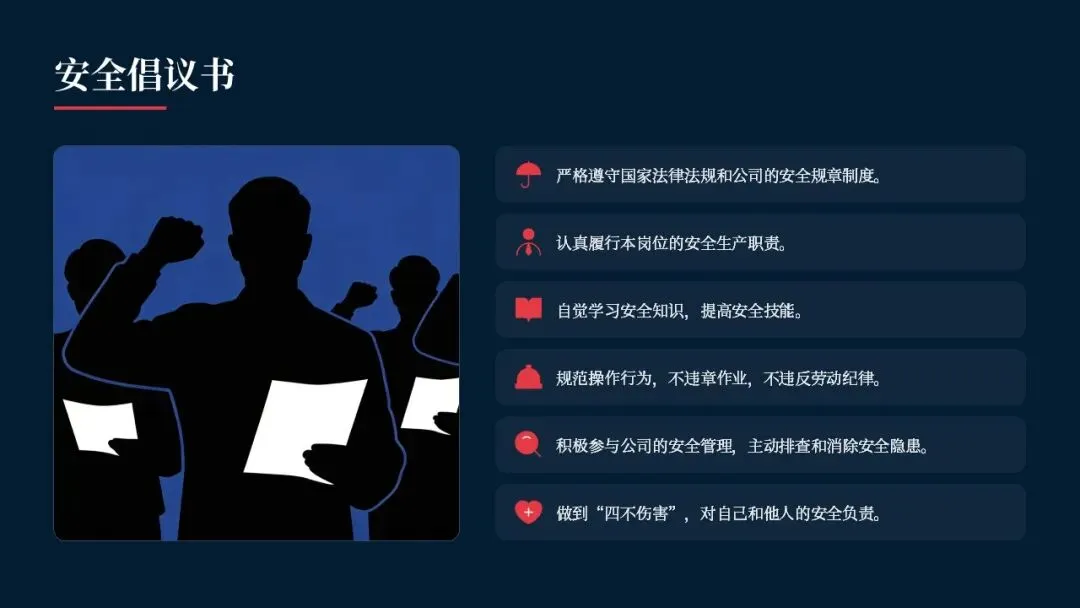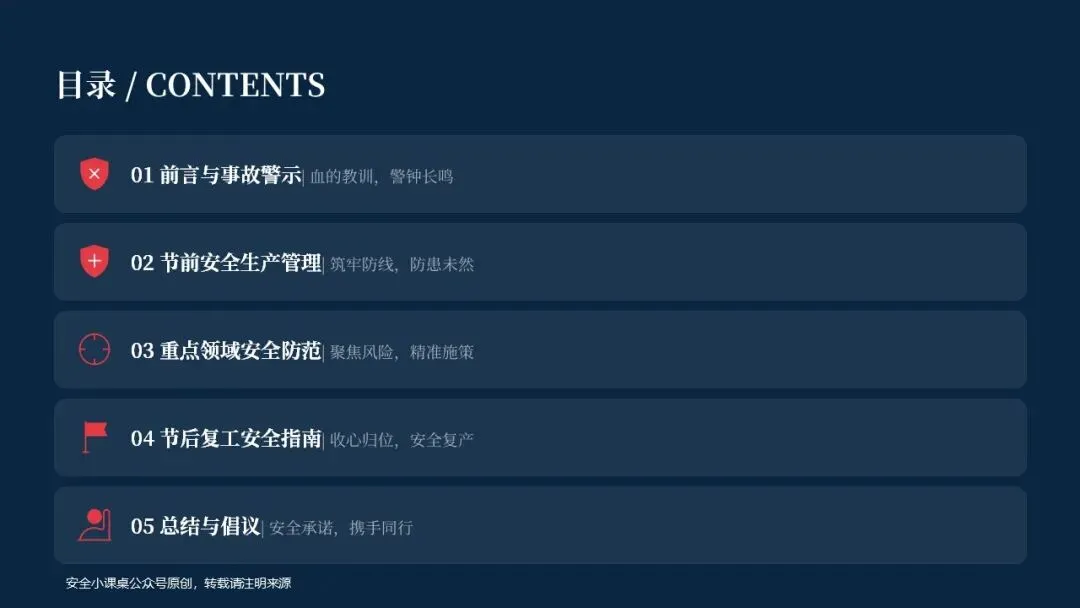 本次培训将分为五个部分。首先,我们将通过近期的重大事故案例,进行一次深刻的事故警示,让大家认识到安全的重要性。接着,我们会详细讲解节前安全生产管理的各项要求和检查重点。第三部分,我们将聚焦于危险作业、消防、用电、交通等重点领域的安全防范知识。第四部分,为大家提供节后复工的安全指南,帮助大家平稳过渡。最后,我们将进行总结,并发出安全倡议。希望通过这五个部分的学习,能全面提升大家的安全素养。