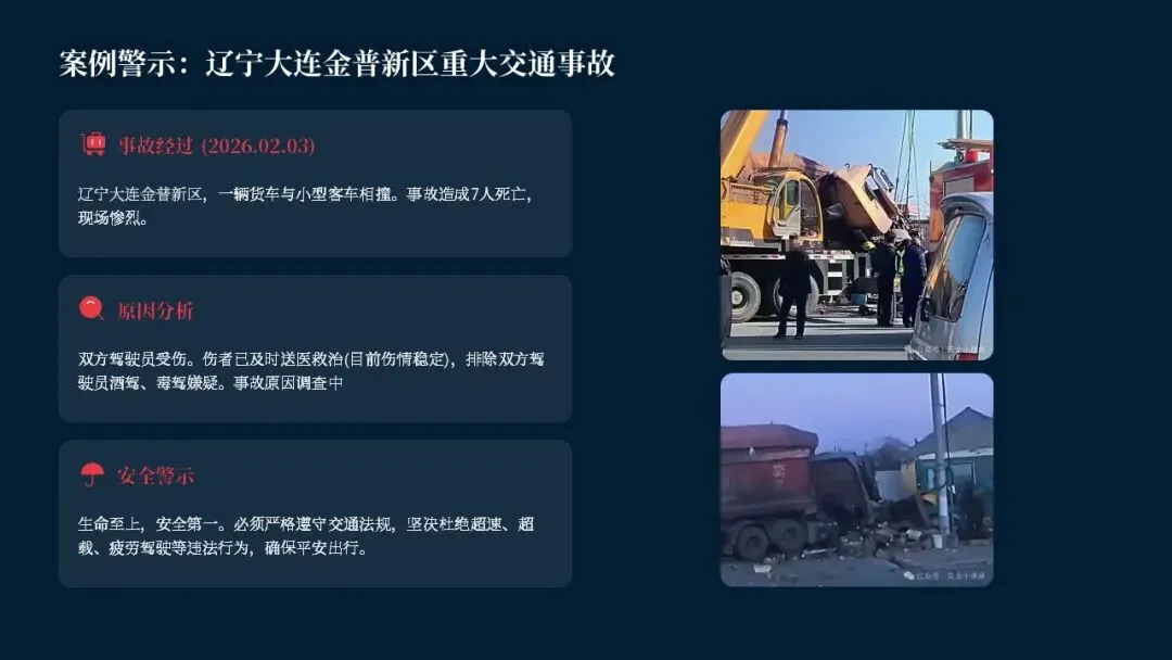 再来看这起发生在辽宁大连的重大交通事故。一辆重型卡车与多辆小车相撞,造成了7人死亡的严重后果。这起事故为我们每一位交通参与者都敲响了警钟。无论是驾驶机动车还是步行,都必须严格遵守交通规则,敬畏生命,安全出行。尤其是在节日期间,车流量大,更要提高警惕,平安回家。