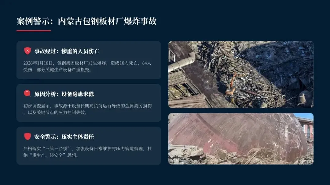 最后,我们来看内蒙古包钢的这起爆炸事故。这起事故造成了10人死亡,84人受伤,教训极其深刻。事故的原因指向了设备的疲劳损伤和压力控制的失效。这警示我们,安全生产责任必须层层压实,严格落实“三管三必须”的原则,无论是管理层还是操作层,都必须对自己职责范围内的安全工作负责到底。同时,要高度重视设备的日常维护和周期性检测。