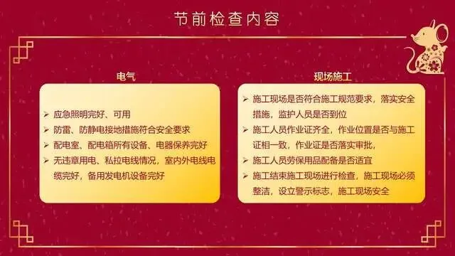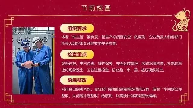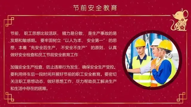 节前,职工思想比较活跃,精力易分散,是生产事故的易发期和敏感期。要牢固树立"以人为本、安全第一"的思想,本着"先安全后生产,不安全不生产"的原则,认真做好安全检查和员工节前安全教育工作