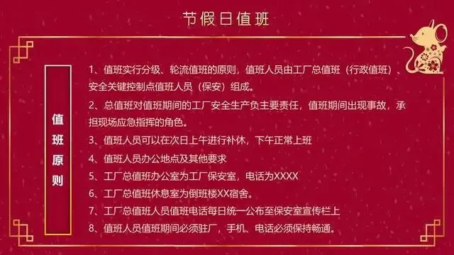 1、值班实行分级、轮流值班的原则,值班人员由工厂总值班(行政值班)安全关键控制点值班人员(保安)组成。