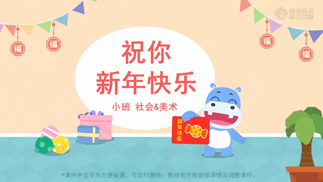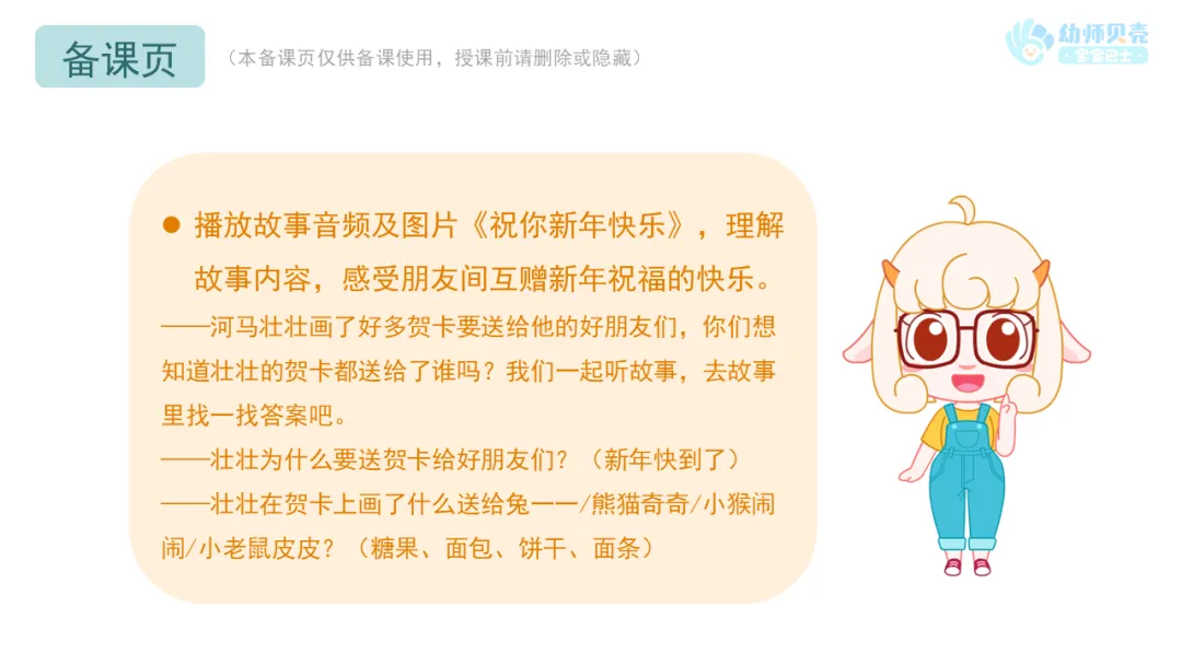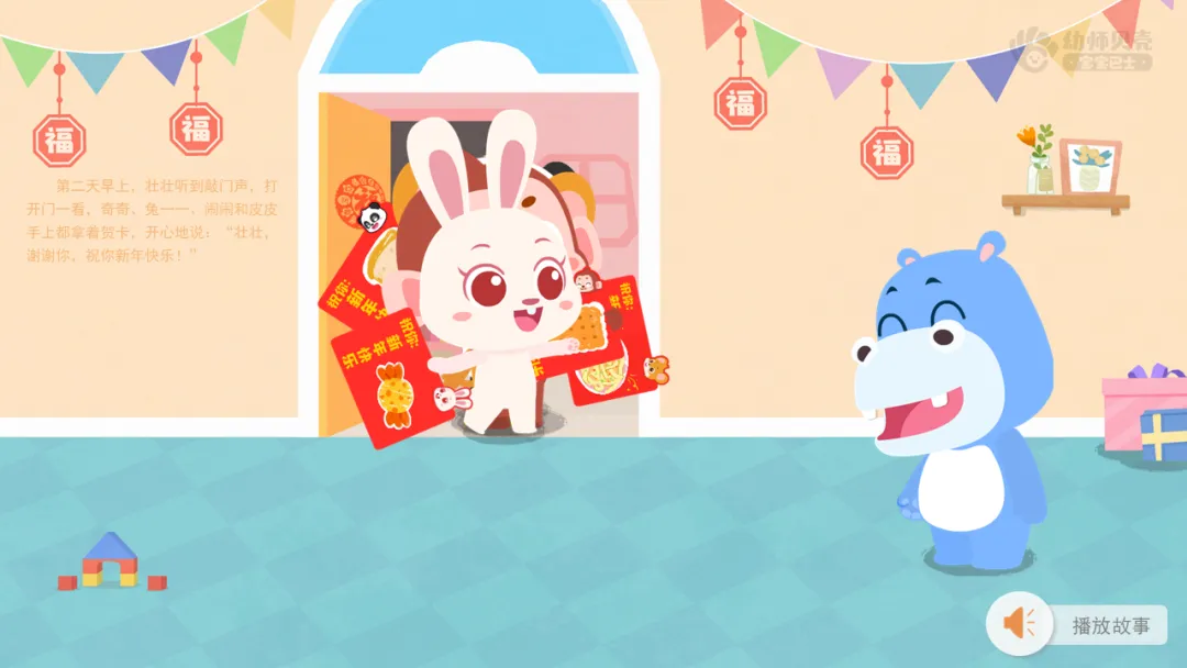 l播放故事音频及图片《祝你新年快乐》,理解故事内容,感受朋友间互赠新年祝福的快乐。
