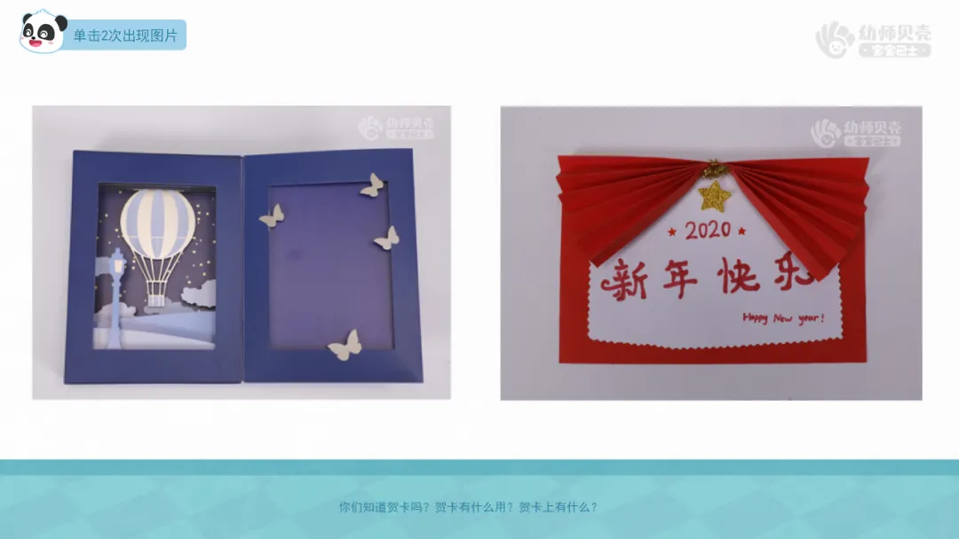 l教师出示材料“装饰好的贺卡”及组图“贺卡”,引导幼儿了解贺卡。
