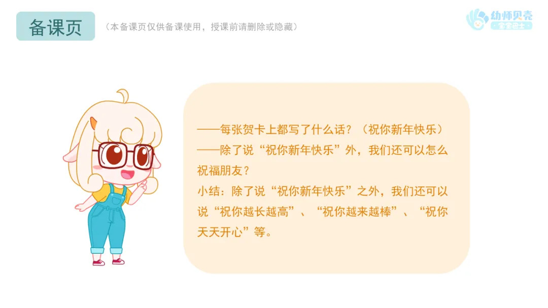 小结:除了说“祝你新年快乐”之外,我们还可以说“祝你越长越高”、“祝你越来越棒”、“祝你天天开心”等。