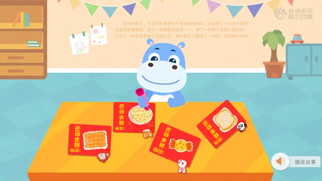 ——河马壮壮画了好多贺卡要送给他的好朋友们,你们想知道壮壮的贺卡都送给了谁吗?我们一起听故事,去故事里找一找答案吧。