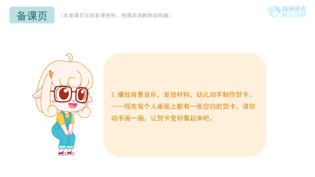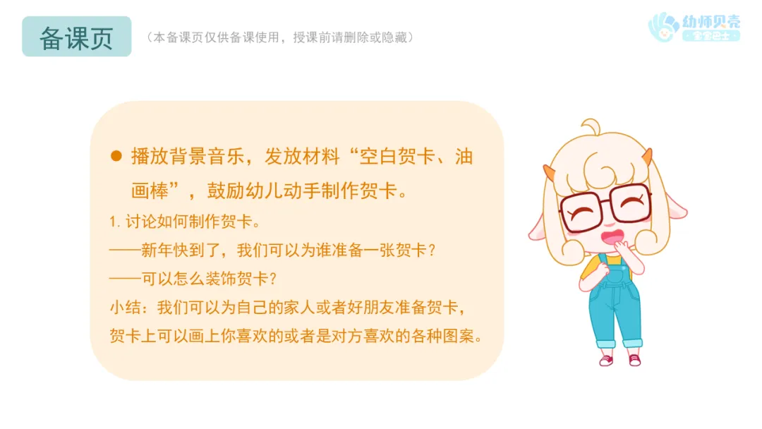 l播放背景音乐,发放材料“空白贺卡、油画棒”,鼓励幼儿动手制作贺卡。