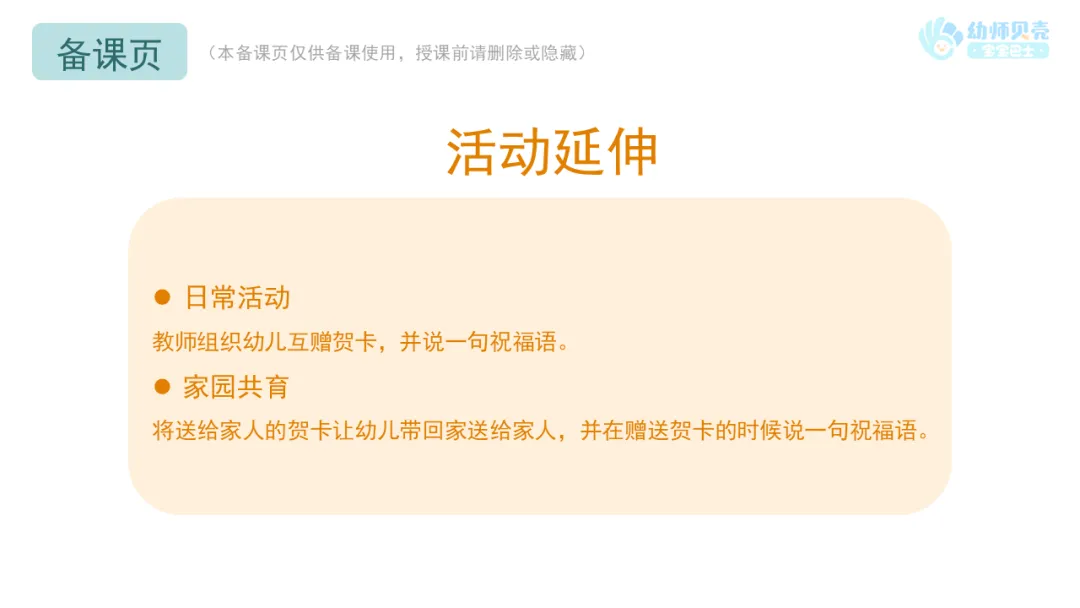 将送给家人的贺卡让幼儿带回家送给家人,并在赠送的时候说一句祝福语。
