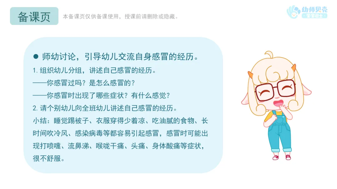 l师幼讨论,引导幼儿交流自身感冒的经历。
