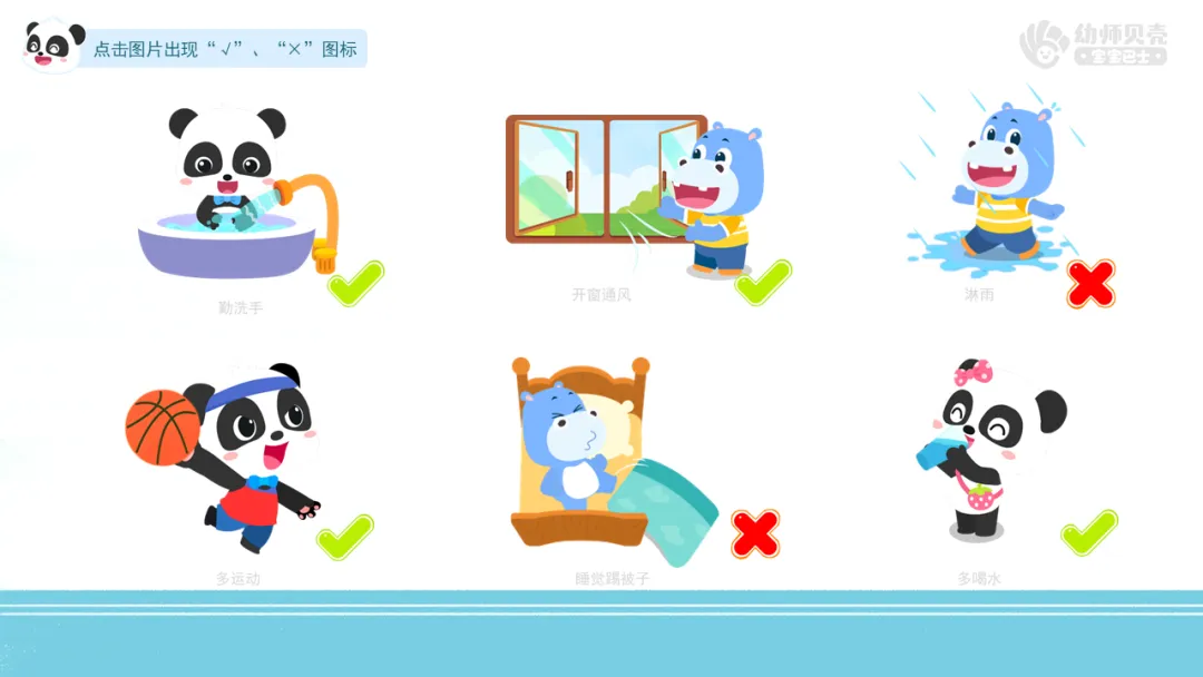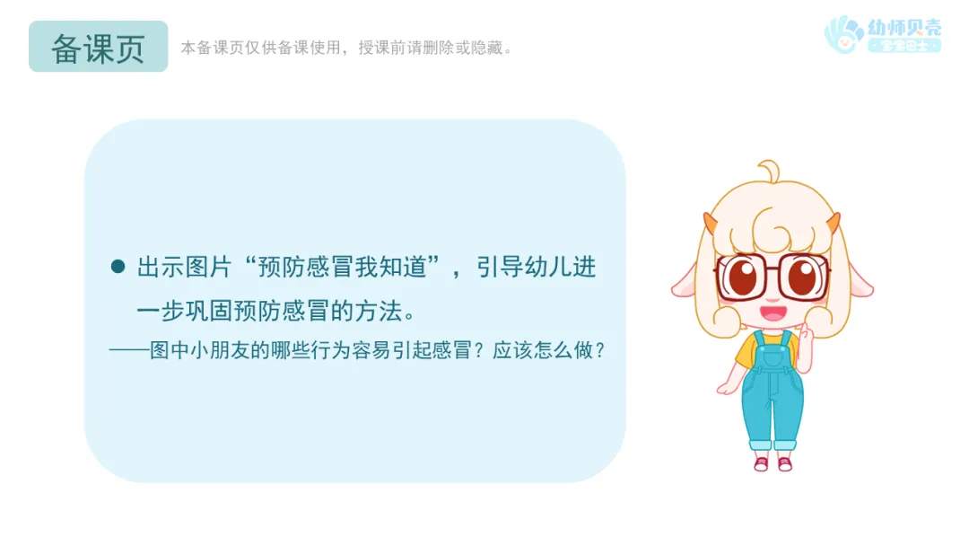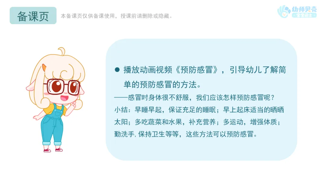 l播放动画视频《预防感冒》,引导幼儿了解简单的预防感冒的方法。