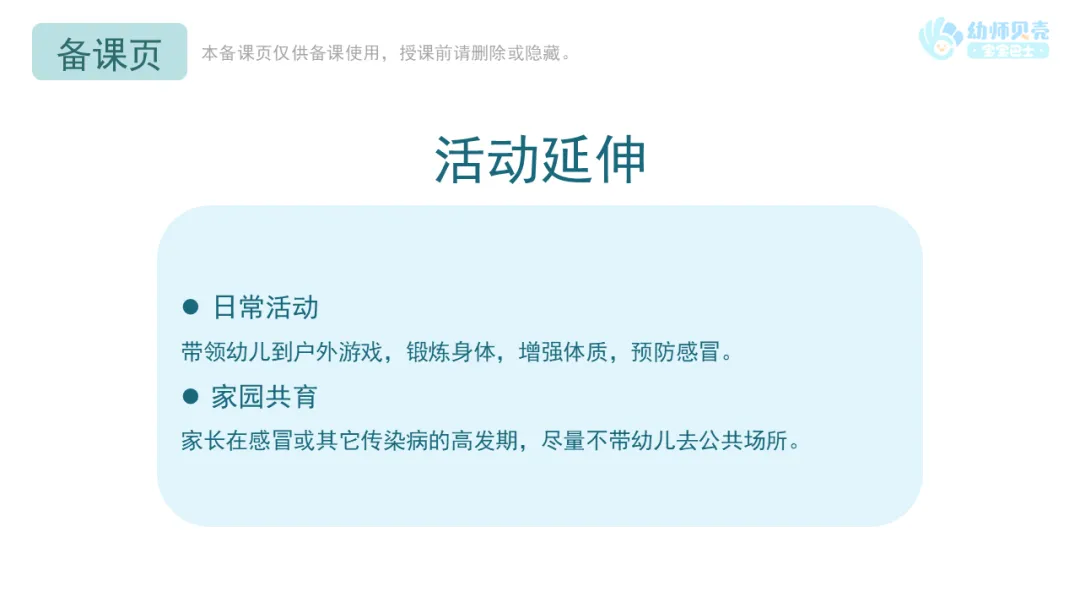 家长在感冒或其它床染病的高发期,尽量不带幼儿去公共场所。