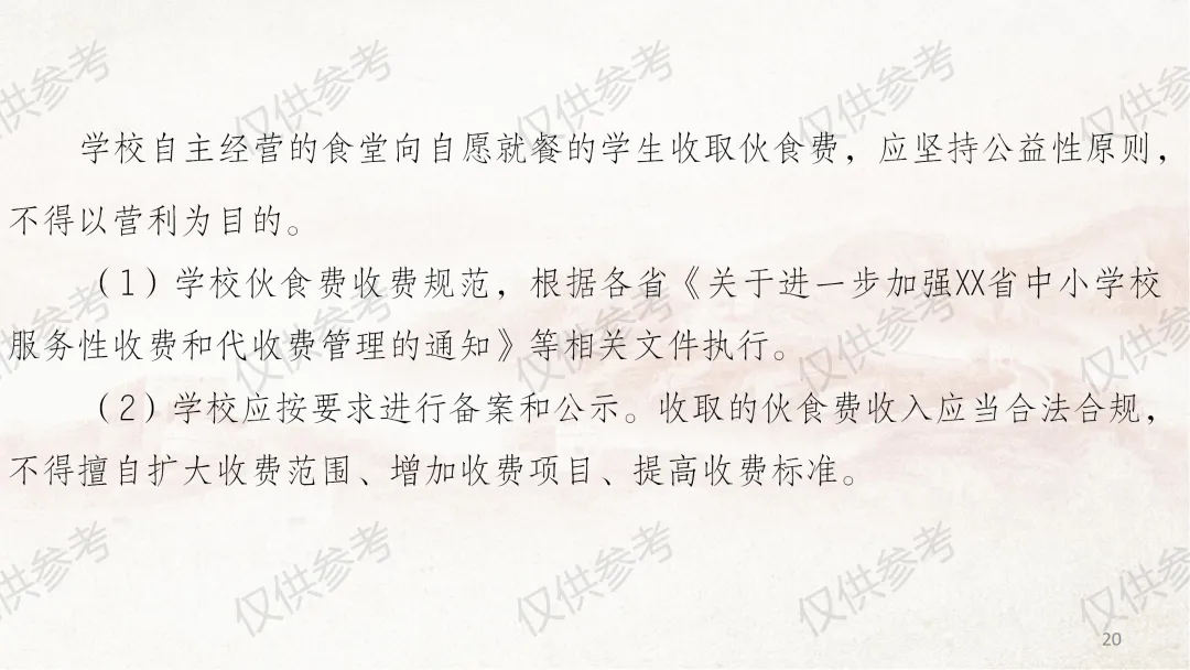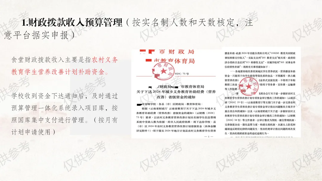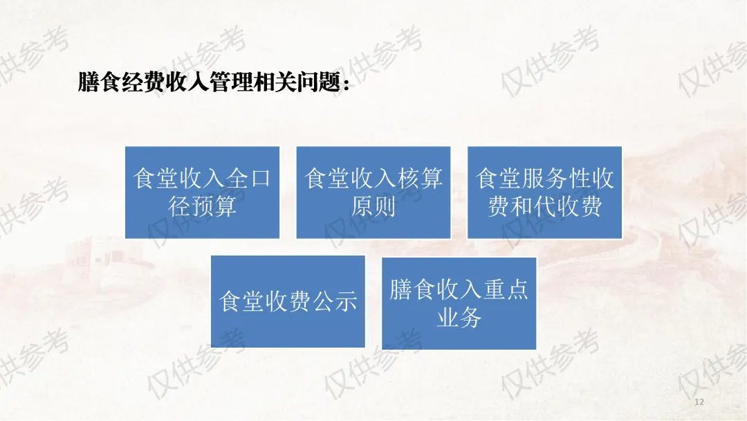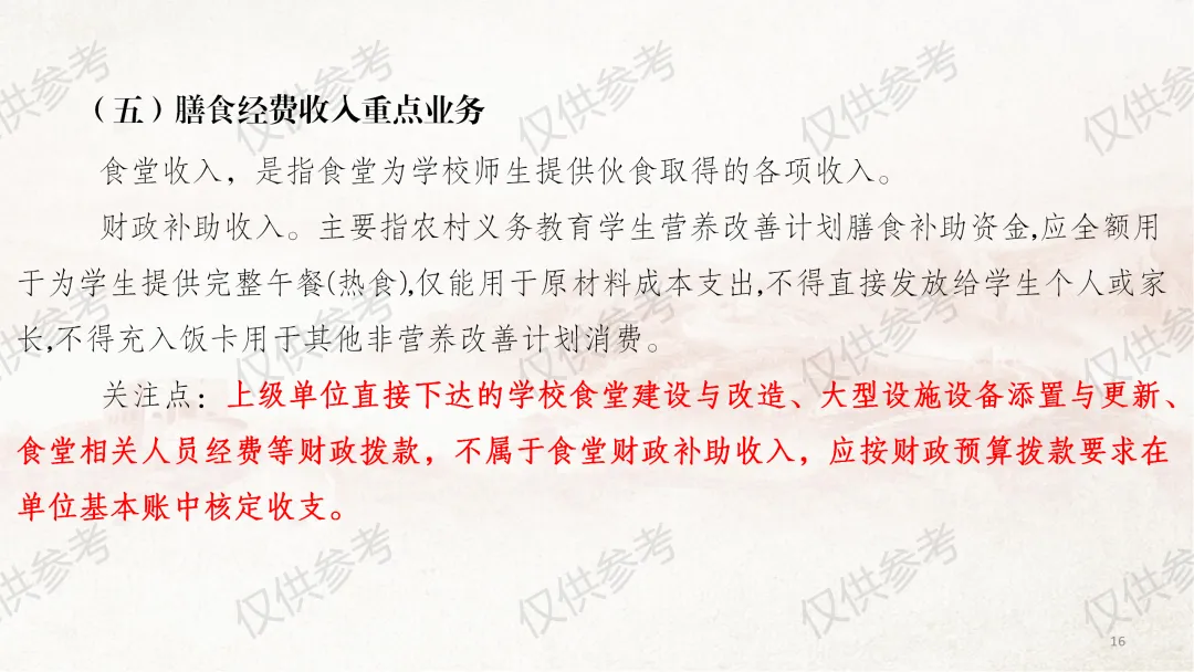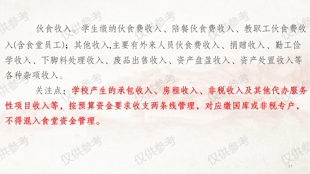 本部分课件严格对照《中小学校财务制度》第四章“收入管理”相关内容编制,并结合食堂管理工作原则和近年来校园餐专项整治要求,对膳食经费收入管理做了进一步细化补充说明。其中,通用收入管理围绕收入定义、收入原则、收入预算、收入合规、票据管理5个方面展开;膳食经费收入管理则从食堂收入全口径预算、食堂收入核算原则、食堂服务性收费与代收费、食堂收费公示、膳食收入重点业务5个维度细化讲解,力求把每个管理环节讲清、讲透。