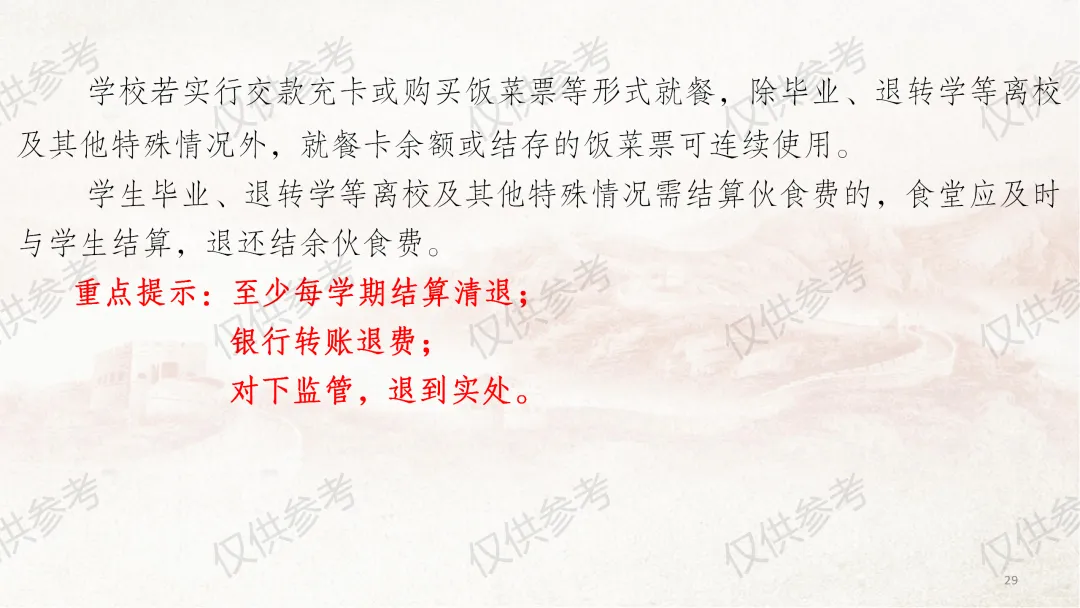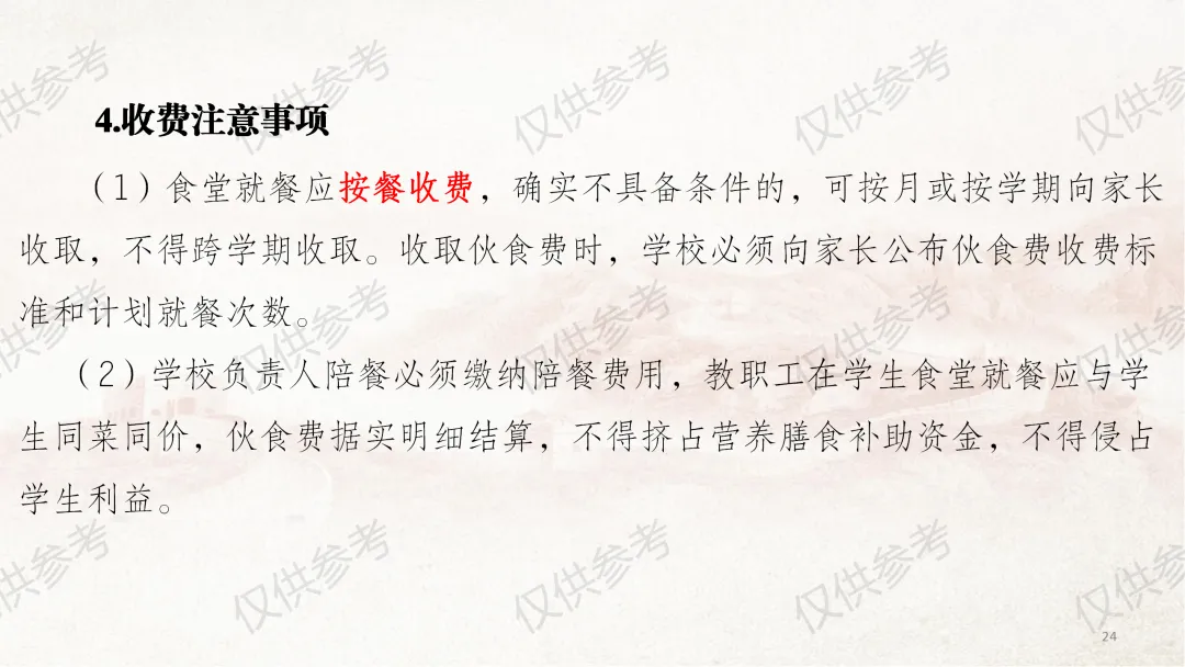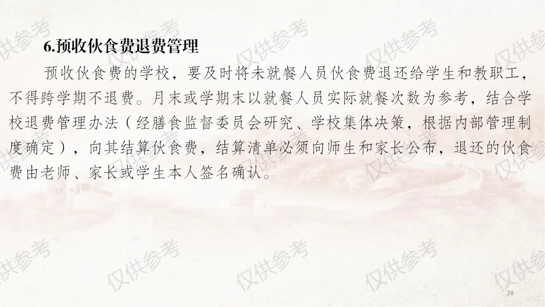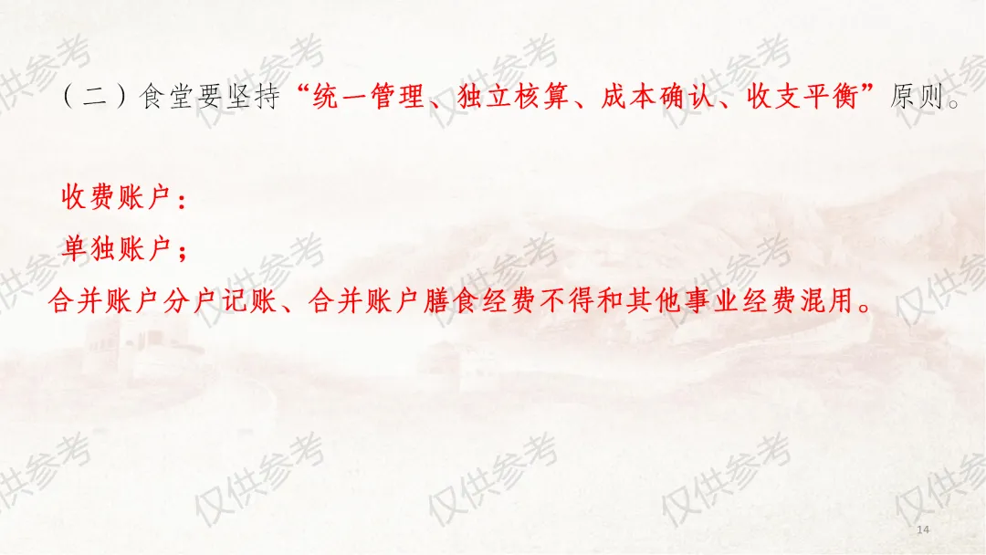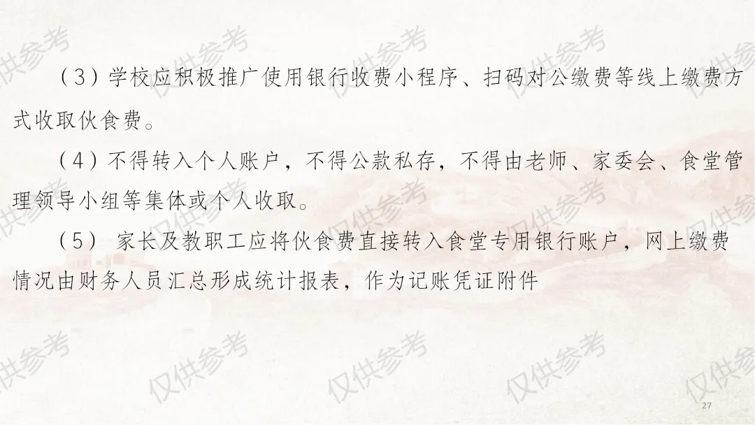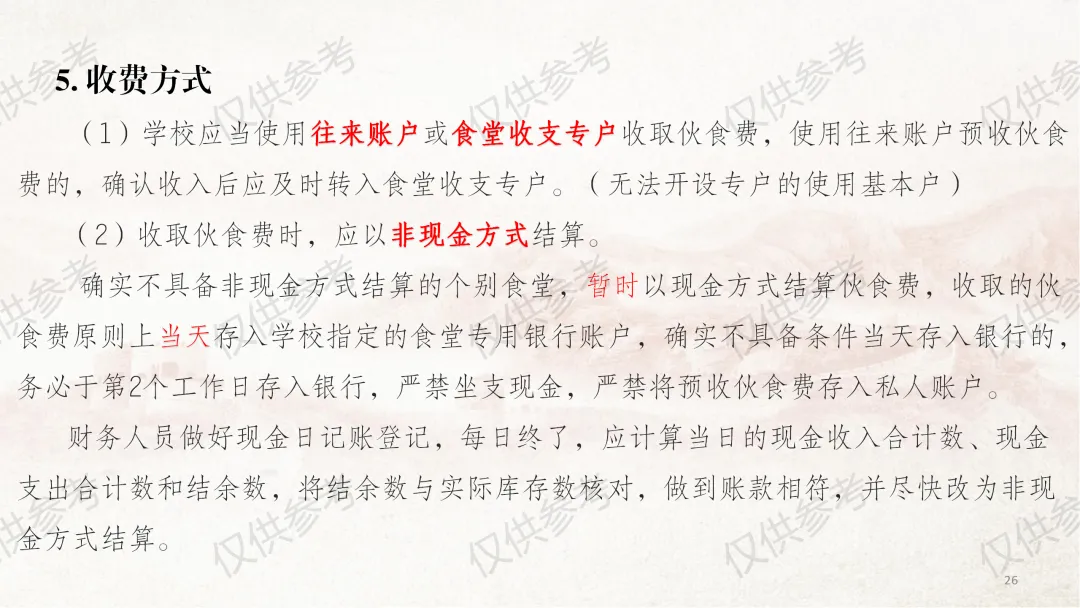 本部分课件严格对照《中小学校财务制度》第四章“收入管理”相关内容编制,并结合食堂管理工作原则和近年来校园餐专项整治要求,对膳食经费收入管理做了进一步细化补充说明。其中,通用收入管理围绕收入定义、收入原则、收入预算、收入合规、票据管理5个方面展开;膳食经费收入管理则从食堂收入全口径预算、食堂收入核算原则、食堂服务性收费与代收费、食堂收费公示、膳食收入重点业务5个维度细化讲解,力求把每个管理环节讲清、讲透。