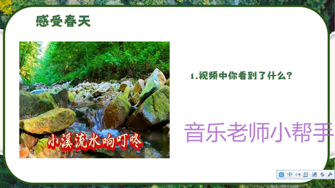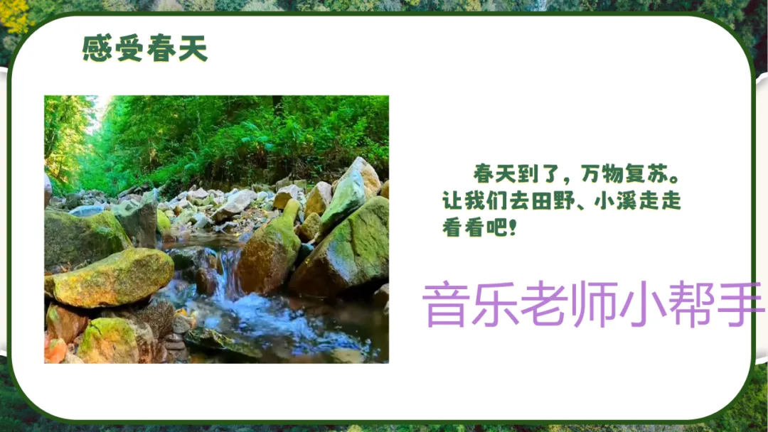 1. 教师播放春天自然风光视频(田野、小溪、花草等),提问:“视频中你看到了什么?感受到了春天怎样的氛围?”引导学生描述春天万物复苏、溪水叮咚的画面。