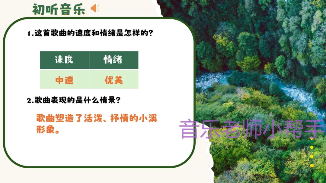2. 师生共同总结,明确音乐核心要素:速度—中速;情绪—整体优美抒情,塑造了活泼、抒情的小溪形象。