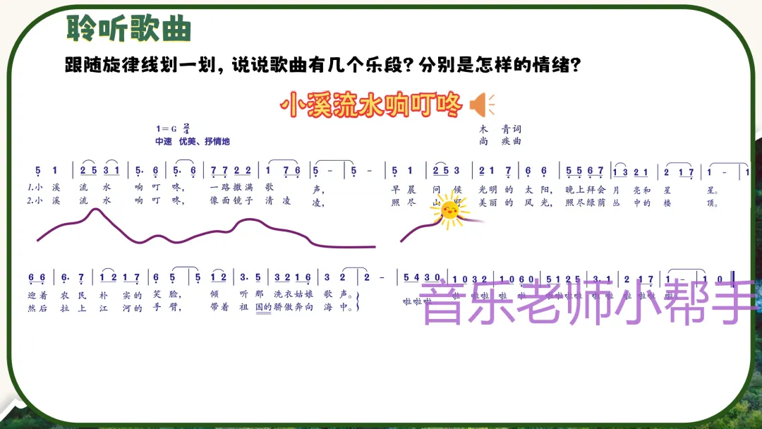 3. 再次轻放音频,提问:“歌曲里描绘了小溪的哪些画面?你仿佛听到了、看到了什么?”引导学生结合歌词想象小溪叮咚流淌、问候太阳月亮、映照山野风光的场景。