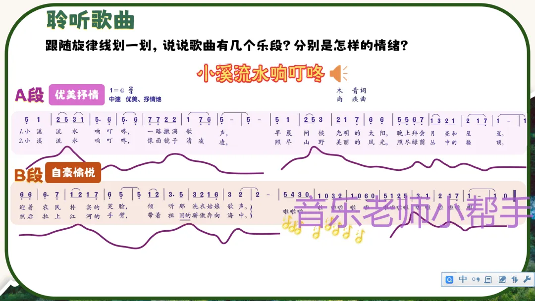 - 师生共同明确:歌曲分为A、B两个乐段;A段—优美抒情,描绘小溪静静流淌的画面;B段—自豪愉悦,表现小溪奔向江河、大海的欢快与骄傲。
