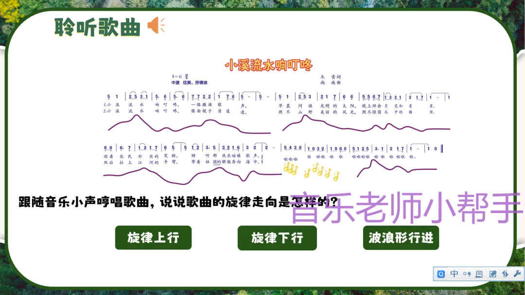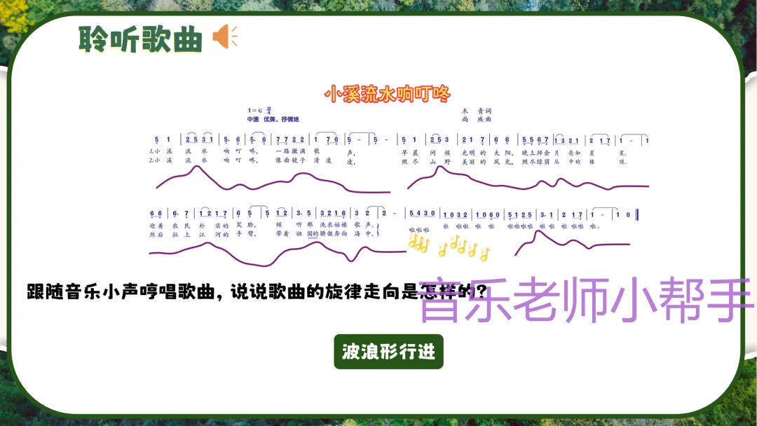 - 结合曲谱,带领学生用“la”模唱旋律,感受旋律的起伏与流畅性,体会旋律与小溪流水画面的融合。