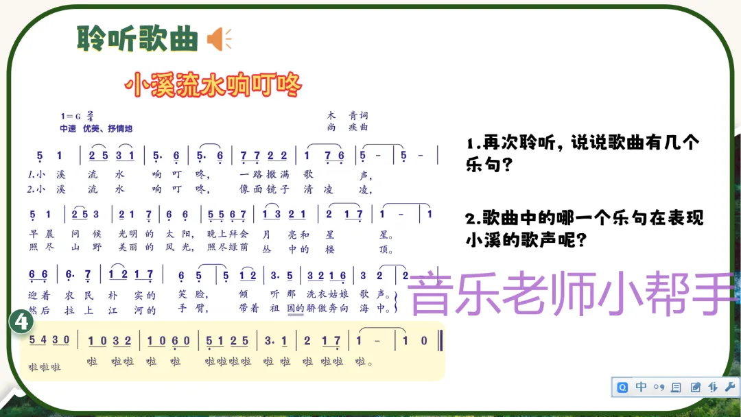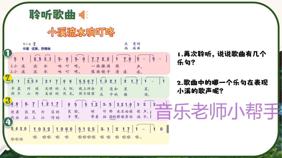 - 播放歌曲,引导学生数出歌曲的乐句数量,提问:“哪个乐句最能表现小溪的叮咚歌声?”(以“啦啦啦”衬词为主的乐句,模拟小溪流水的叮咚声)