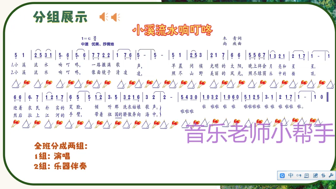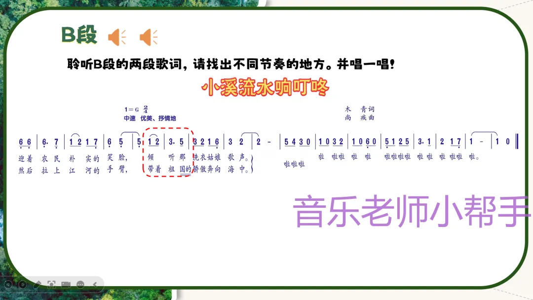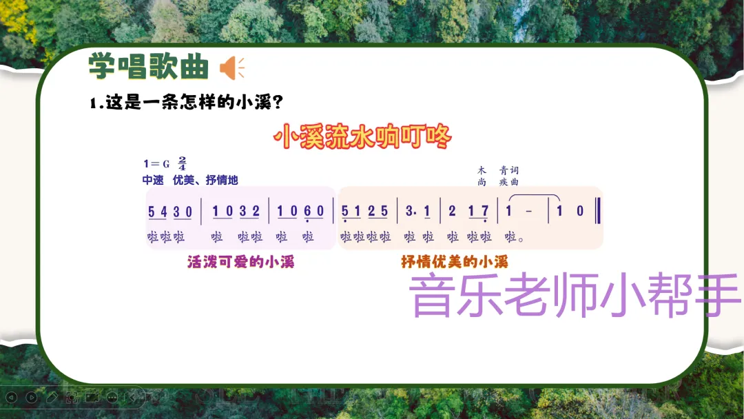 难点:分辨歌曲的乐段划分,把握B段节奏的变化;用合适的声音和乐器表现小溪的形象和歌曲的情感。