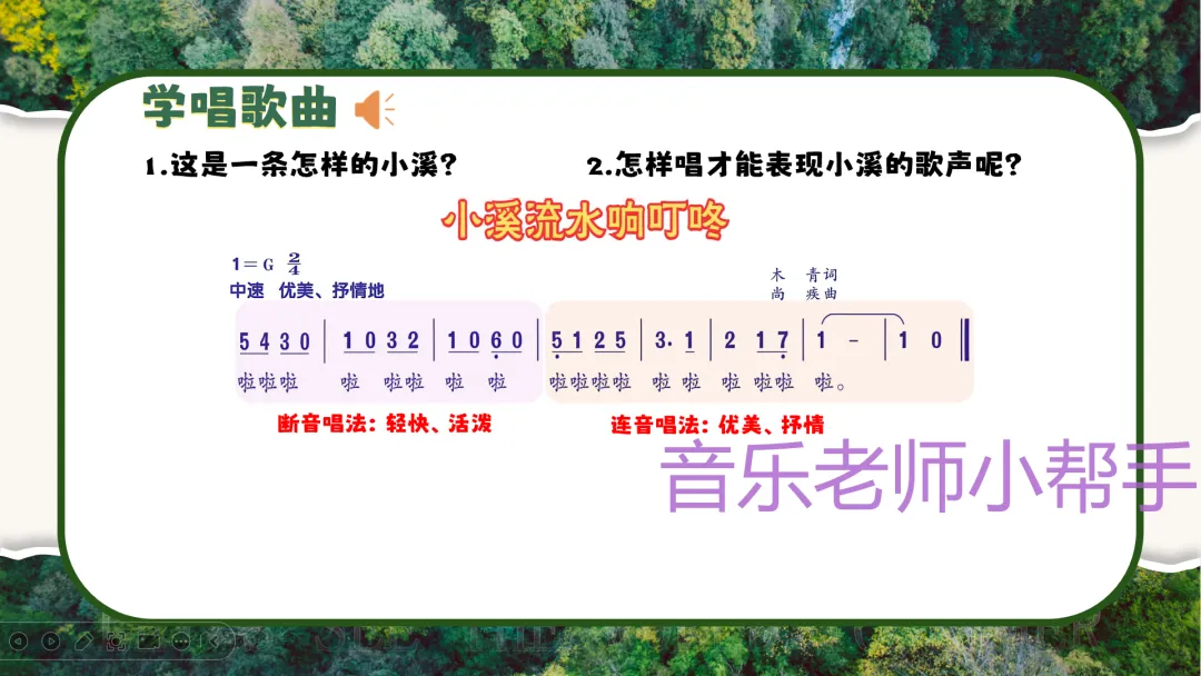 - 讲解断音唱法和连音唱法:断音唱法轻快活泼,适合表现小溪的叮咚声;连音唱法优美抒情,适合表现小溪缓缓流淌的画面,为演唱做铺垫。