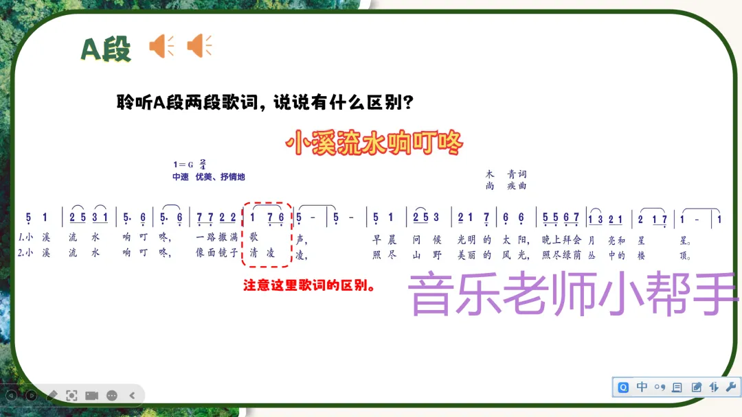 A段学唱:教师范唱A段,强调用连音唱法,声音流畅、轻柔,唱出小溪抒情优美的特点;带领学生逐句学唱,纠正字音和节奏,注意两段歌词的细微区别。