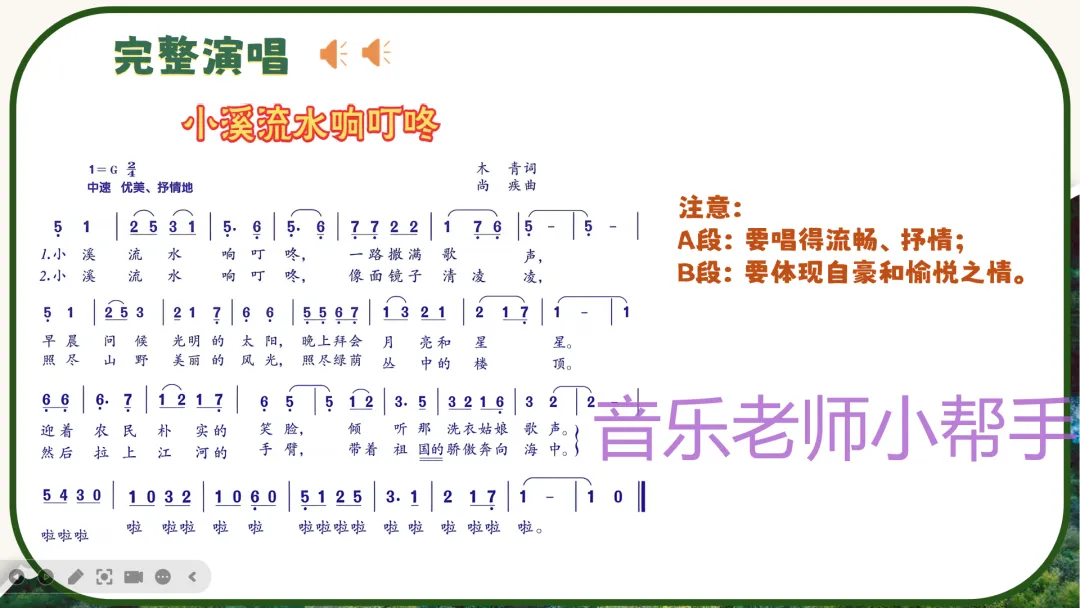 - 播放伴奏,带领学生完整演唱歌曲,强调A段流畅抒情、B段自豪愉悦的情绪切换,做到声情并茂。