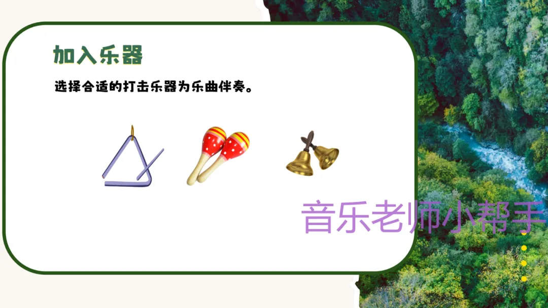 - 教师出示沙锤、铃鼓、三角铁等打击乐器,引导学生思考:“哪些乐器适合为A段伴奏?哪些适合B段?”(A段用三角铁,轻柔敲击模拟小溪叮咚;B段用沙锤、铃鼓,轻快伴奏表现欢快氛围)
