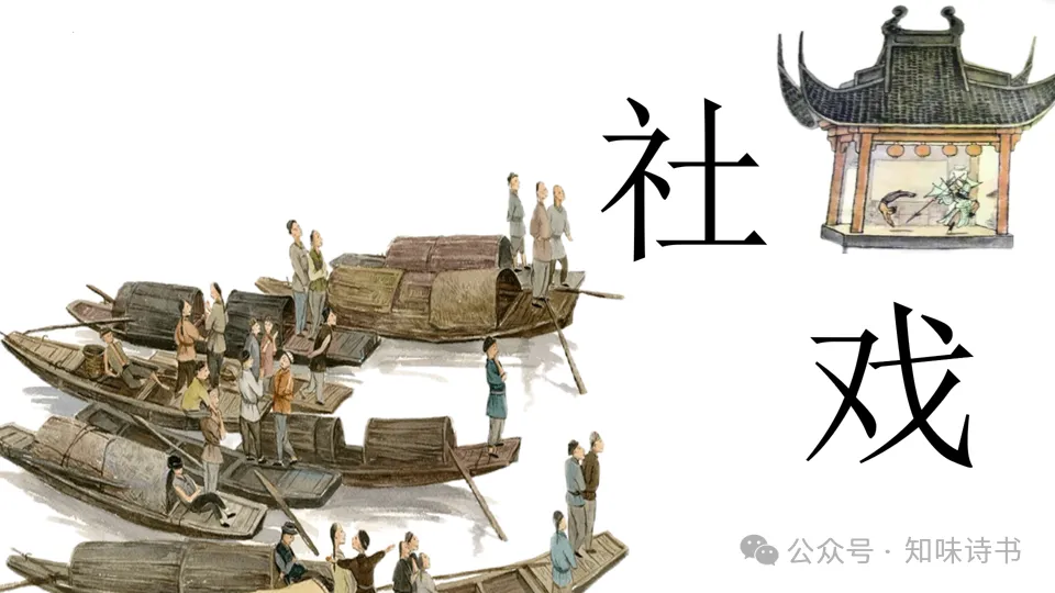 “社”,表示祭祀,“土”是土地神。古代把土地神和祭祀土地神的地方叫“社”。按照我国民间的习俗,每到播种或收获的季节,农民们都要立社祭祀,祈求或酬报土地神。在绍兴地区,后来发展为以演戏的形式祭祀这时候演的戏就称为“社戏”。通常演出于庙台或野台,也有把戏台搭在河水里的,观众岸上、船上都可以看戏。