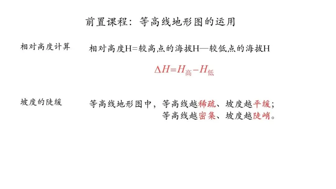首先,让我们一起回忆初一上学期所学的地形的判读,相对高度的计算是什么?是较高点的海拔减较低点的海拔;那如何在等高线地形图上判断坡度的陡缓?等高线越稀疏,坡度越缓;等高线越密集,坡度越陡。以及如何判断山谷和山脊,等高线发生弯曲的地方,向高处凸出则为山谷,向低处凸出则为山脊,也就是高谷低脊。
