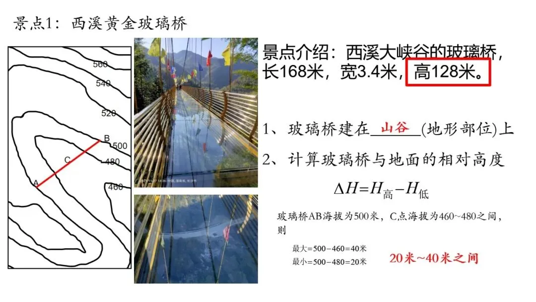 明天我们要去的第一个景点就是黄金玻璃桥,我们一起来看一下景点介绍。接下来,一起看等高线地形图,谁能说一说玻璃桥的地形部位是什么?