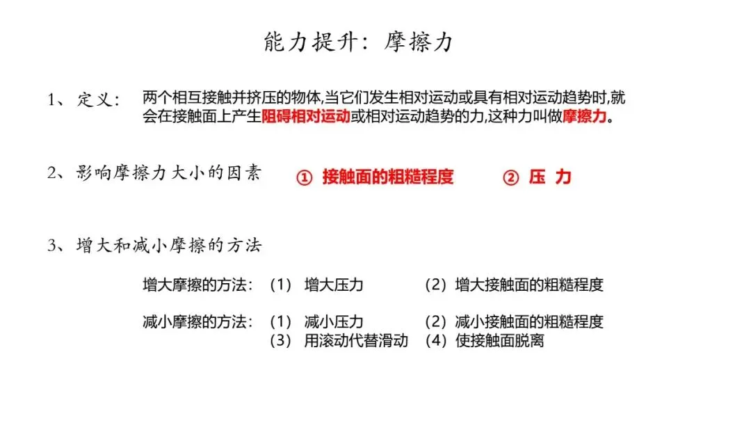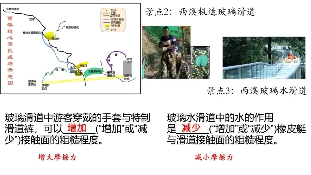 所以,有的时候对于商家的宣传,我们还是要保持清醒的头脑,在游玩的过程中要不要过于紧张,但是也要提高自身的安全意识。接下来我们就来回忆摩擦力的知识,摩擦力的是阻碍物体相对运动的力,主要受接触面的粗糙程度和压力的影响,要增大摩擦力可以增大压力、也可以增大接触面的粗糙程度。减少接触面的粗糙程度可以减少摩擦力。