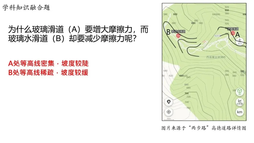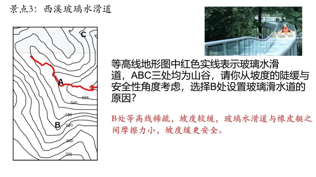 师:是的,B处等高线稀疏,坡度较缓,玻璃水滑道与橡皮艇之间摩擦力小,坡度缓更安全。