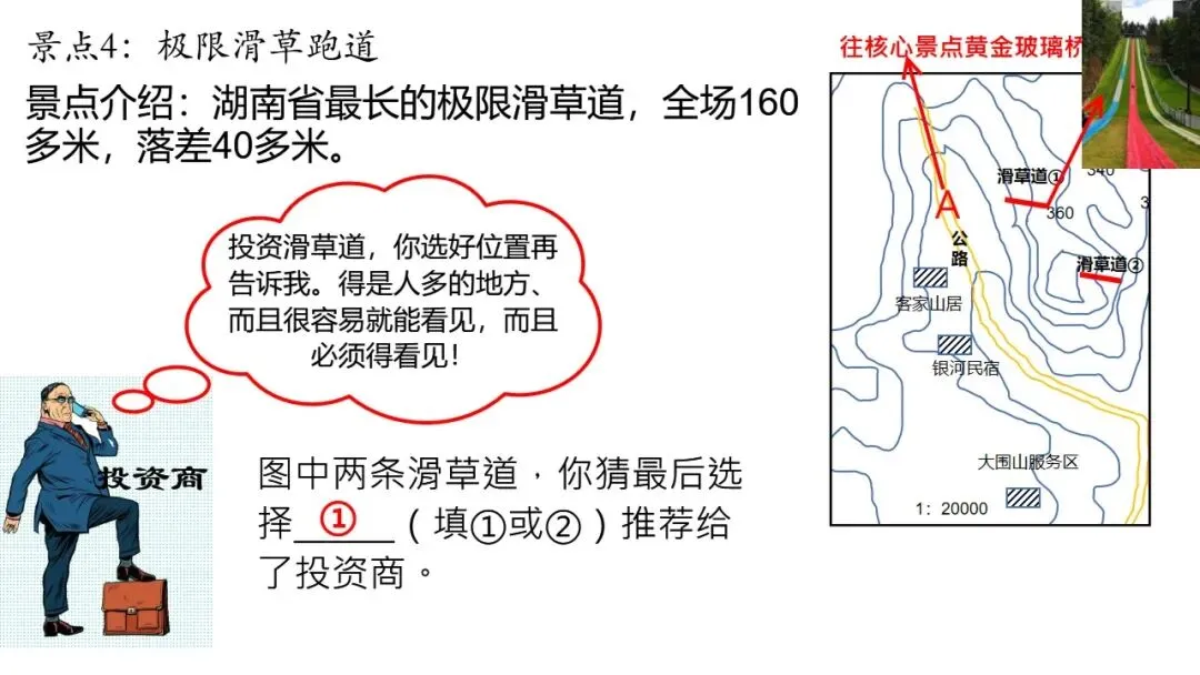看题,投资商说:“投资滑草道,你选好位置再告诉我。得是人多的地方、而且很容易就能看见,而且必须得看见!”