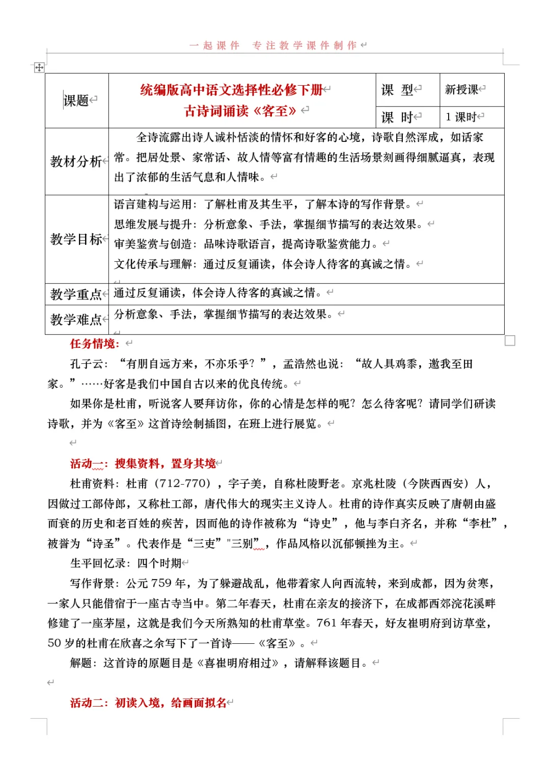 >【一起语文选择性必修下】|《客至》:课件+教学设计