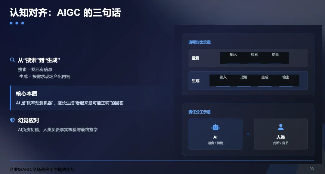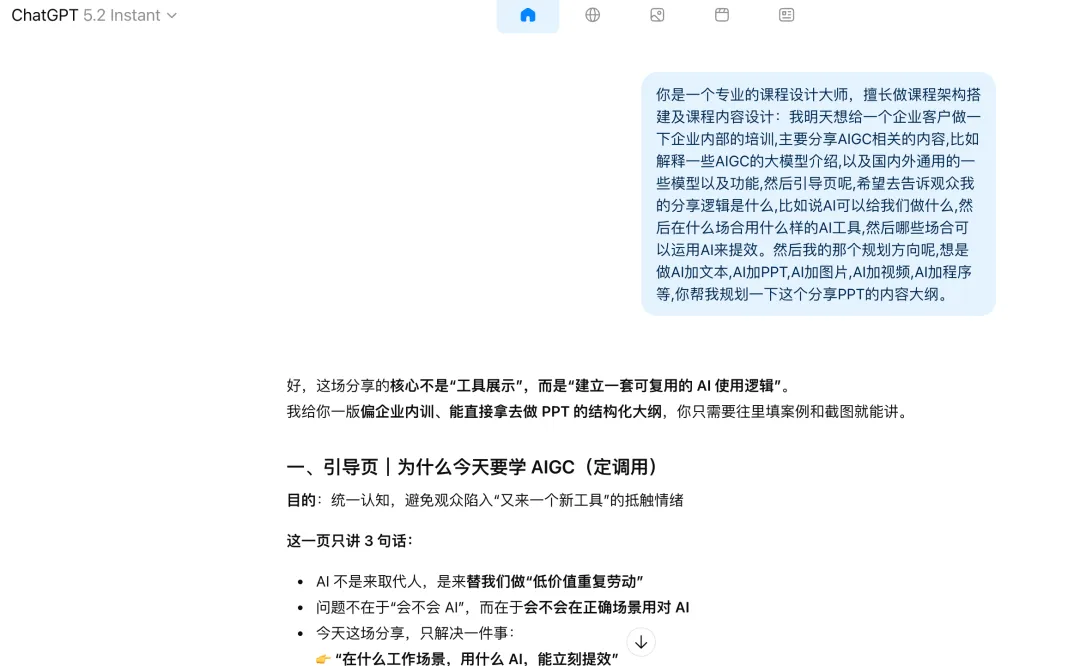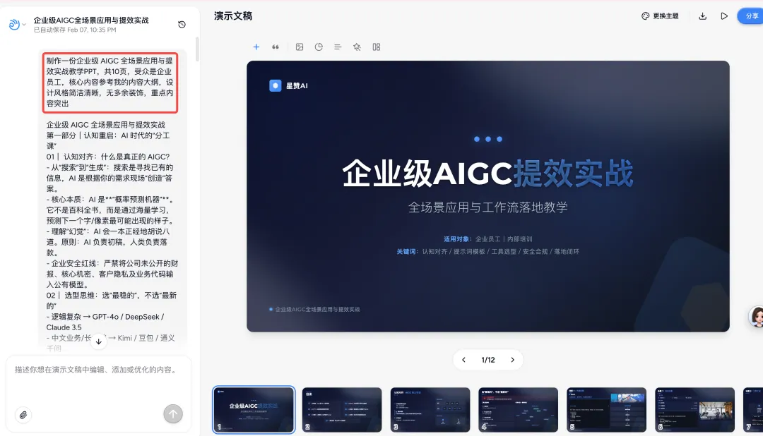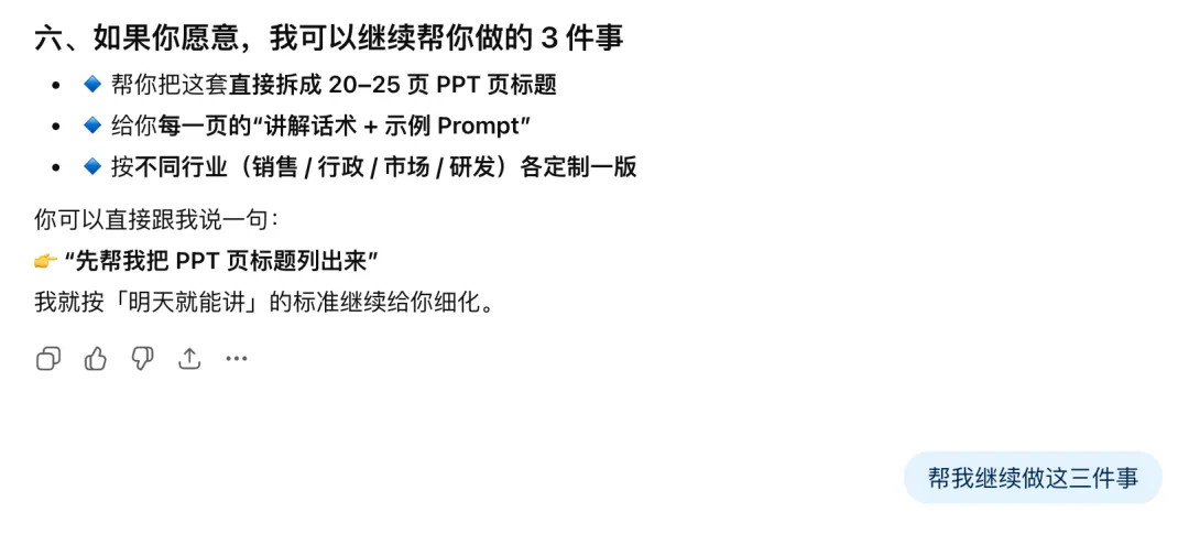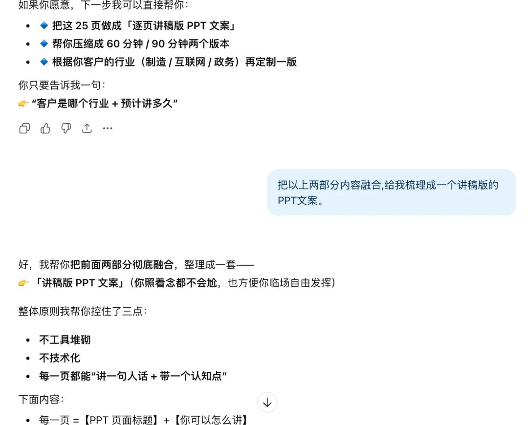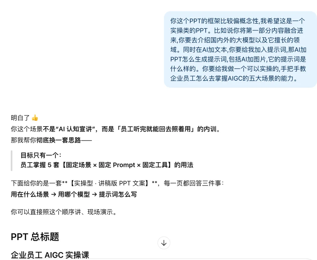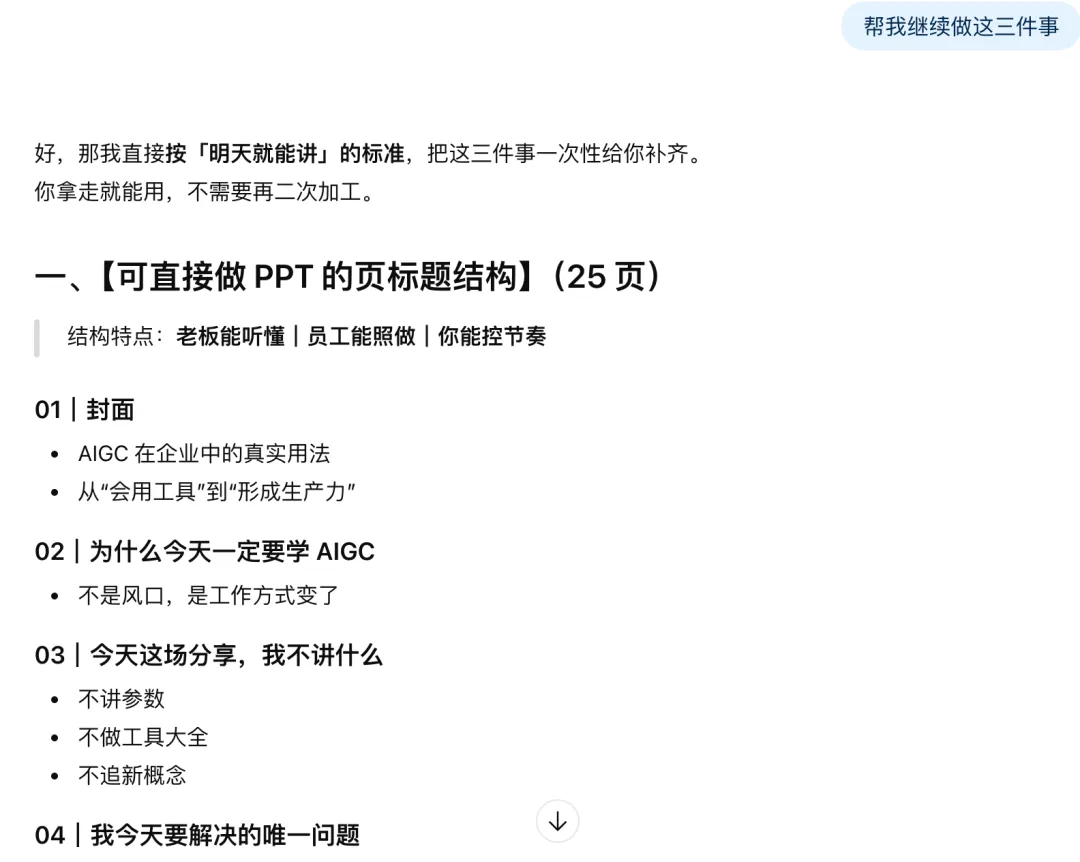 于是周六晚上,我给自己设了个小目标:不用模板、不堆工具,只用我现在已经掌握的那套 AI 方法结合周六下午参加培训的心得,把一份 0–1 的分享 PPT 从无到有梳理出来。