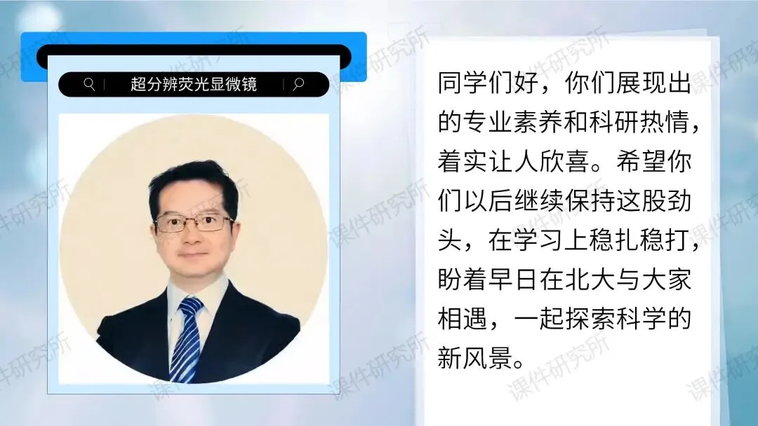 在群里磨课后,其他老师给出很多有效的建议,共同完善了课件。导入结合最新时政,播放北大席鹏教授超分辨荧光显微镜的科普介绍视频,制作席鹏教授AI数字人,发布招募实验室助理员的任务,以闯关的形式激发学生的积极性和主动性,提高复习效率。