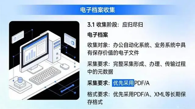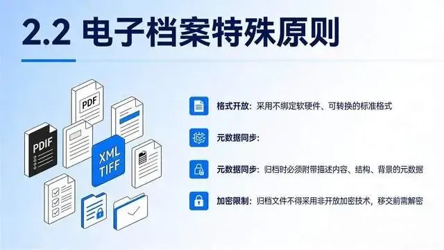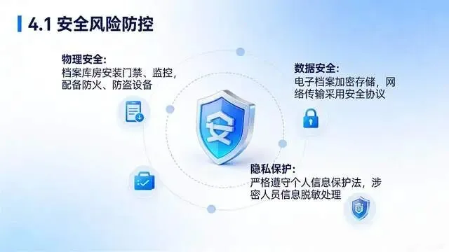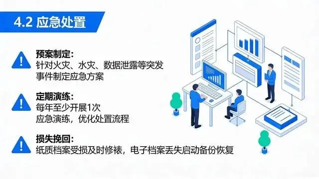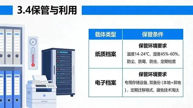 统一电子档案格式,建立异地备份机制,定期检测存储载体,档案管理系统做好安全防护