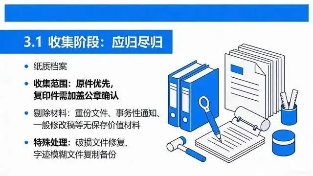 明确各部门收集责任,制定《文件收集范围清单》,档案管理岗定期督促,移交时严格审核