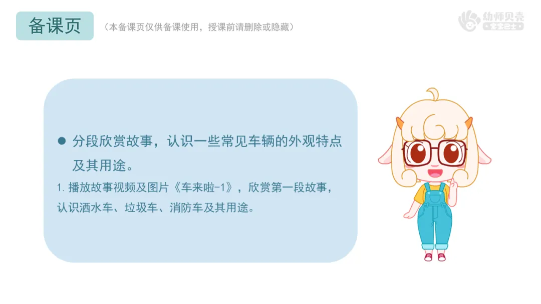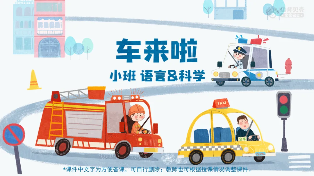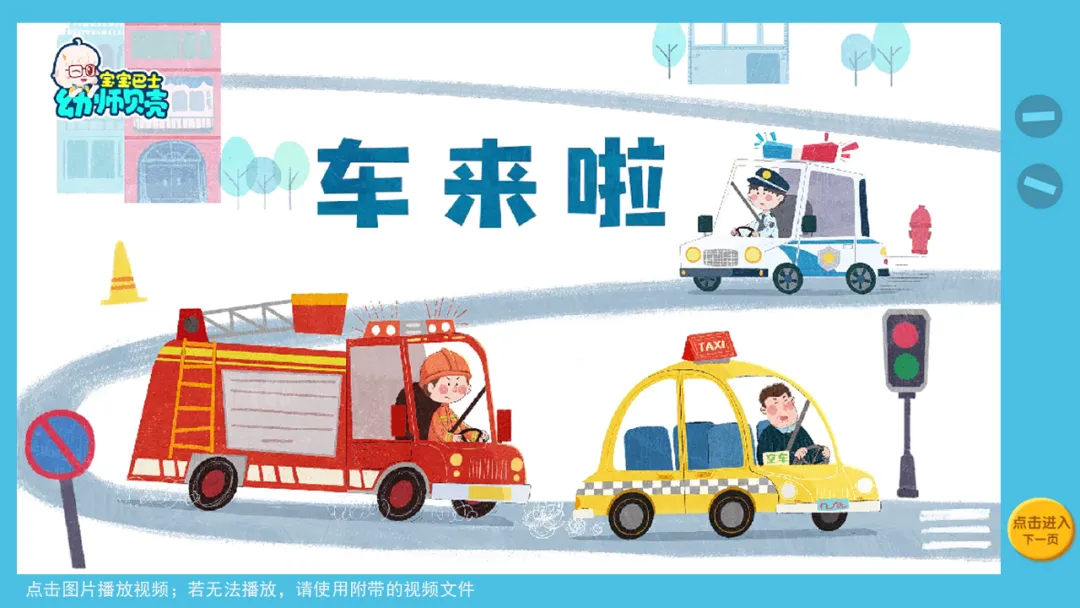 l分段欣赏故事,认识一些常见车辆的外观特点及其用途。