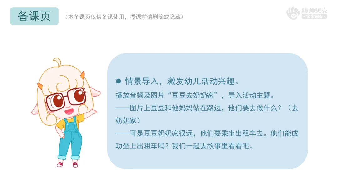 播放音频及图片“豆豆去奶奶家”,导入活动主题。