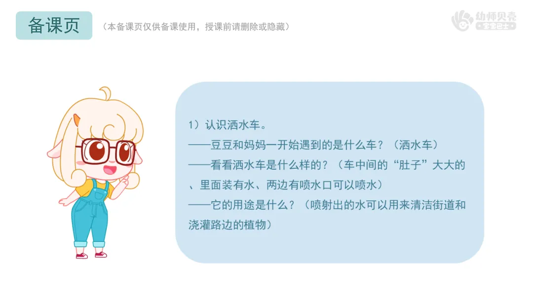 1.播放故事视频及图片《车来啦-1》,欣赏第一段故事,认识洒水车、垃圾车、消防车及其用途。