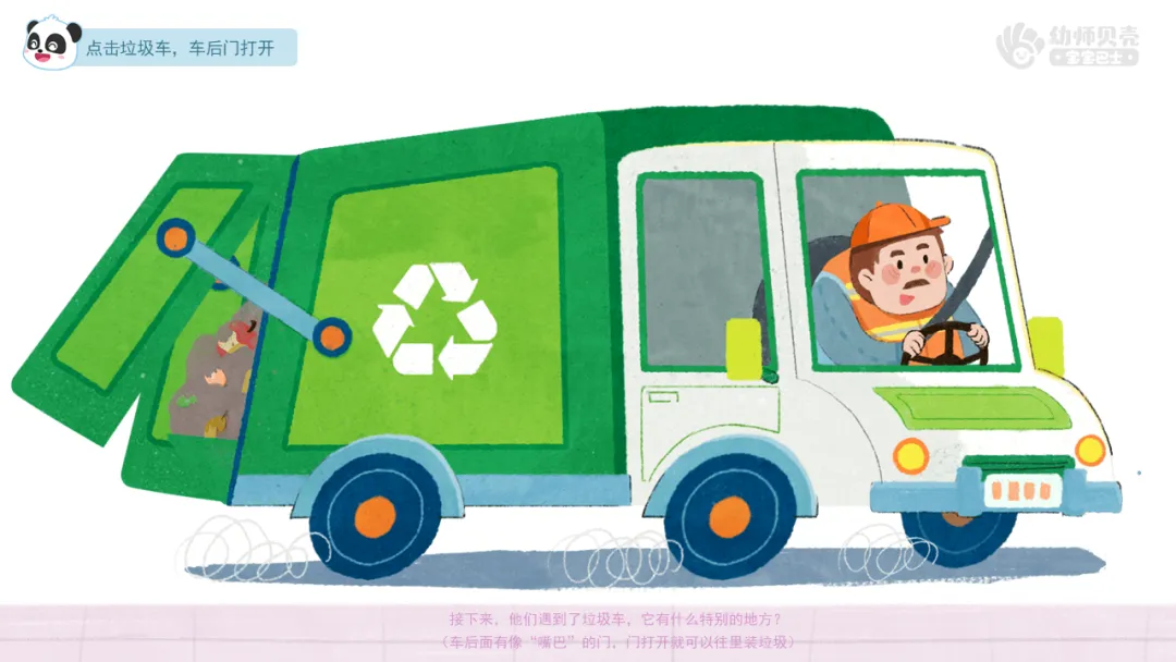 ——接下来,他们遇到了垃圾车,它有什么特别的地方?(车后面有像“嘴巴”的门,门打开就可以往里装垃圾)