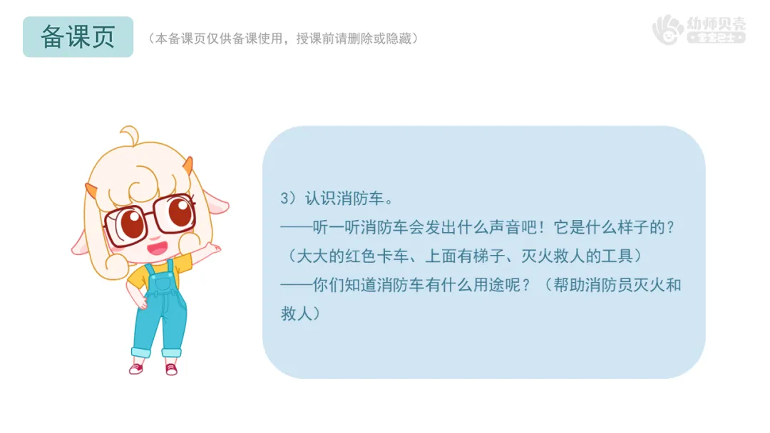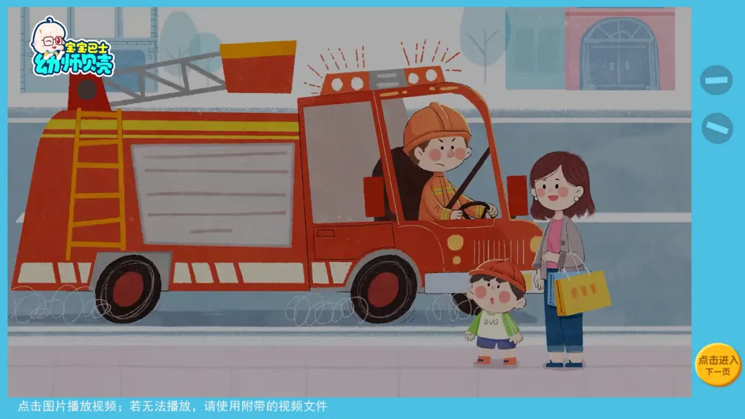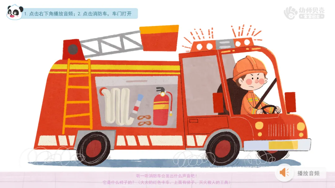 ——听一听消防车会发出什么声音吧!它是什么样子的?(大大的红色卡车、上面有梯子、灭火救人的工具)