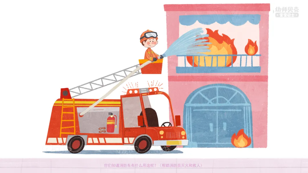 ——你们知道消防车有什么用途呢?(帮助消防员灭火和救人)