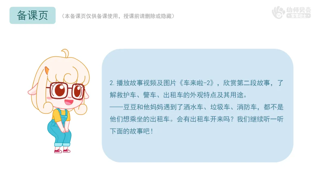 2.播放故事视频及图片《车来啦-2》,欣赏第二段故事,了解救护车、警车、出租车的外观特点及其用途。
