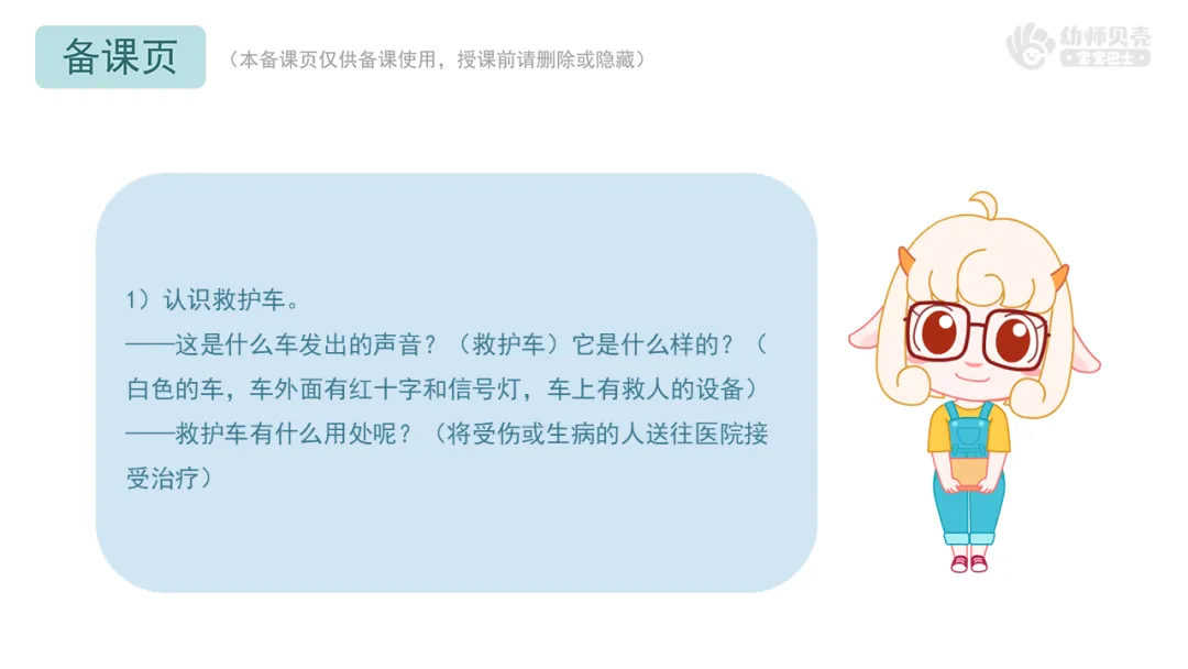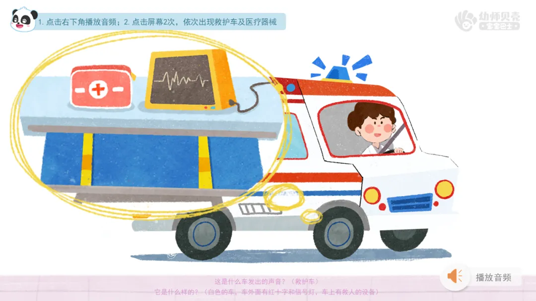 ——这是什么车发出的声音?(救护车)它是什么样的?(白色的车,车外面有红十字和信号灯,车上有救人的设备)